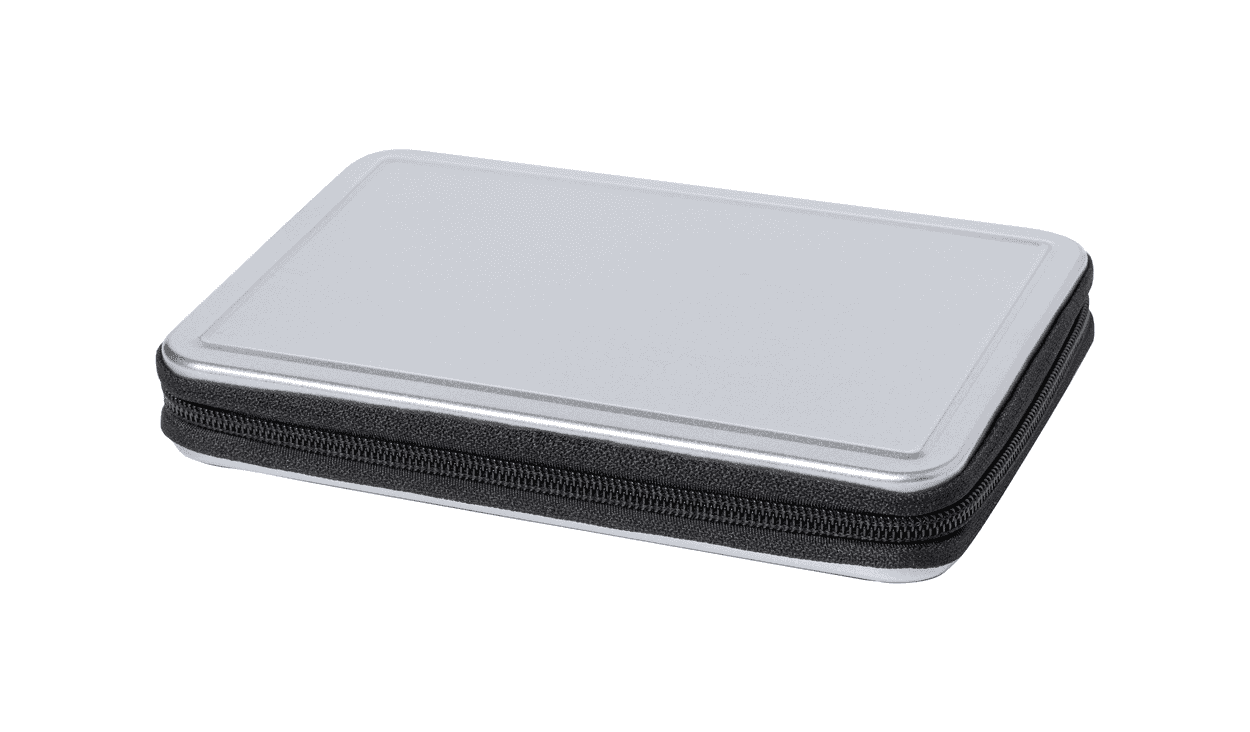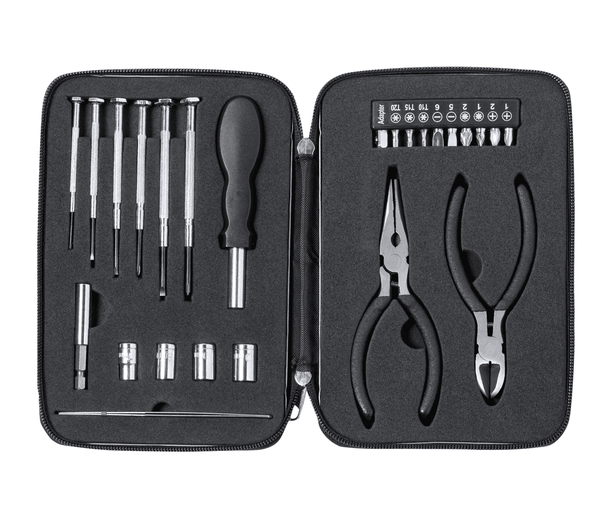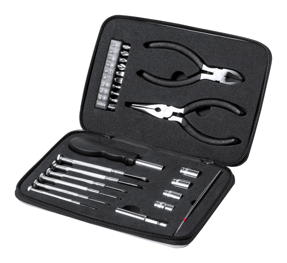 25 ks kovová sada nářadí v hliníkovém pouzdře na zip. Obsahuje: dlouhé kleště, štípací kleště, nástrčný šroubovák, nástavec, pinzeta, 6 přesných šroubováků, sada nástrčných klíčů 4 ks, sada 10 ks bitů na šroubovák.