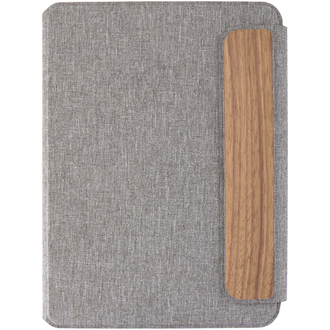 Portfolio Andean velikosti A5 je částečně vyrobeno z recyklovaného polyesteru s certifikací RCS, což nabízí udržitelnější alternativu snížením závislosti na primárních materiálech. Mají elegantní šedou pevnou vazbu se zaoblenými rohy a precizně svařovanou technologii a jsou zajištěny magnetickým uzávěrem, který je zvýrazněn detailem z ořechového dřeva, což dodává moderní a sofistikovaný nádech. Uvnitř najdete odnímatelný zápisník s měkkou vazbou a 64 linkovanými listy papíru krémové barvy s gramáží 80 g/m², který je vyroben ze zodpovědných zdrojů. Dodáváno v obalu z kraftového papíru.