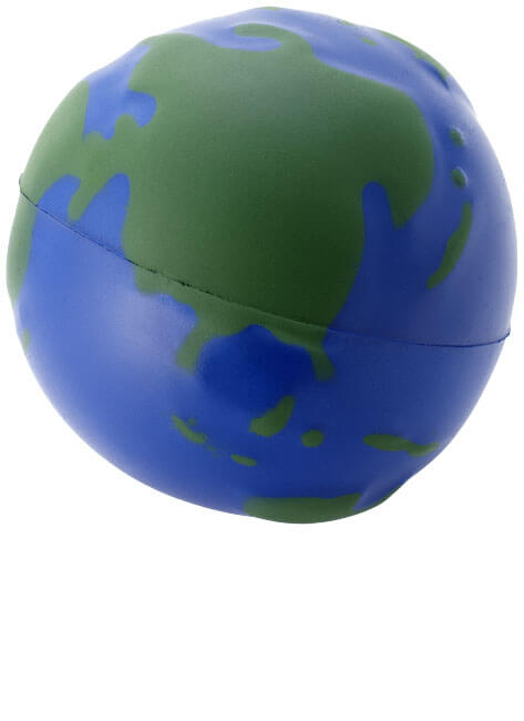 Antistresový míček s designem zeměkoule. Antistresové pomůcky se nepatrně liší v hustotě, barvě, velikosti a hmotnosti v důsledku postupu lisování, což může zabránit přesnému a jednotnému potisku. Potisk se může narušit. Pouze základní barvy. PU Plastic foam.