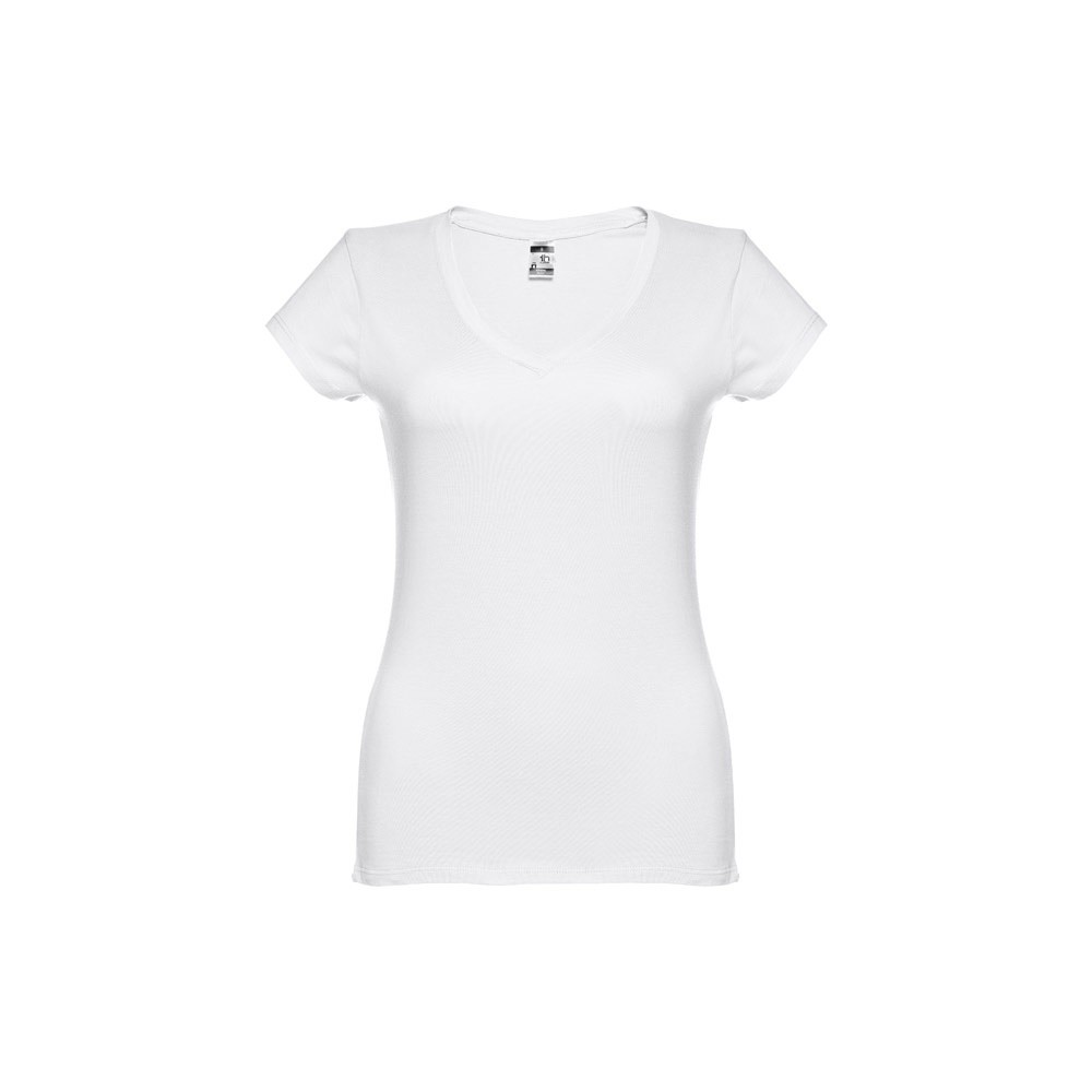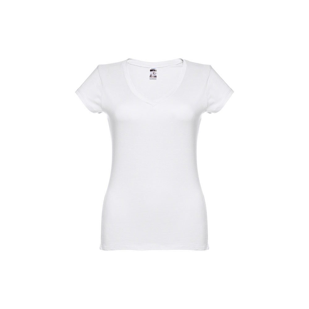 Dámské žerzejové tričko přiléhavého střihu ze 100% bavlny (150 g/m²). Krátký rukáv. Výstřih do V s překrytím. Vyztužené lemování. Žerzejový rolák. Dvojité prošití na rukávech. Spodní část. Střiženo a sešito.