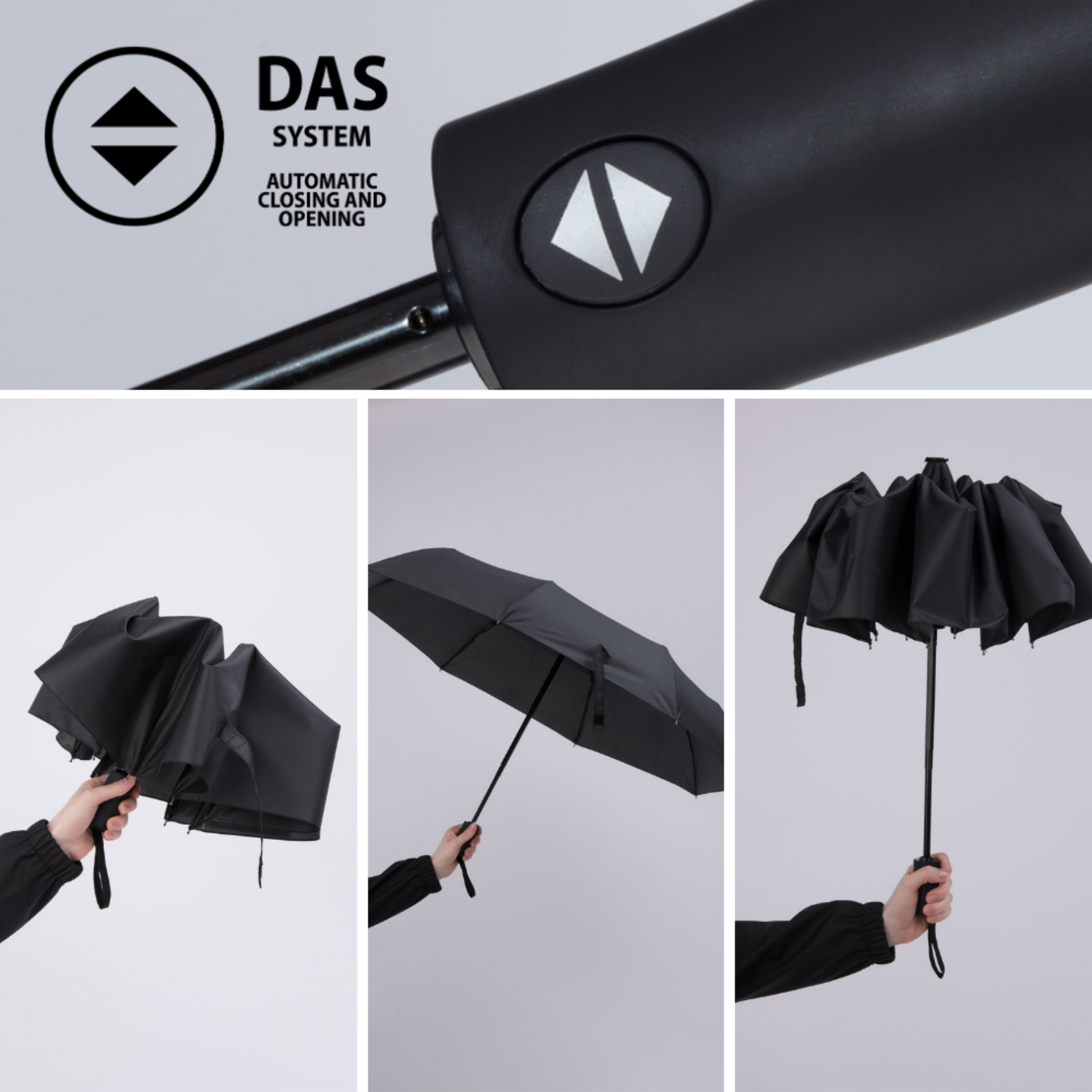 Malý a šikovný deštník s DAS (Double Automatic System - automatické zavírání a otevírání). Jeho malá velikost vám umožní vzít si deštník kamkoli s sebou, takže je ideální pro každodenní použití. Vyroben z polyesteru 180T, díky čemuž je Produkt lehký a přitom spolehlivý. Plastová rukojeť pokrytá pogumovanou úpravou poskytuje nejen komfort, ale také pevné uchopení v ruce. Deštník je zcela odolný vůči větru. Včetně ochranného krytu.