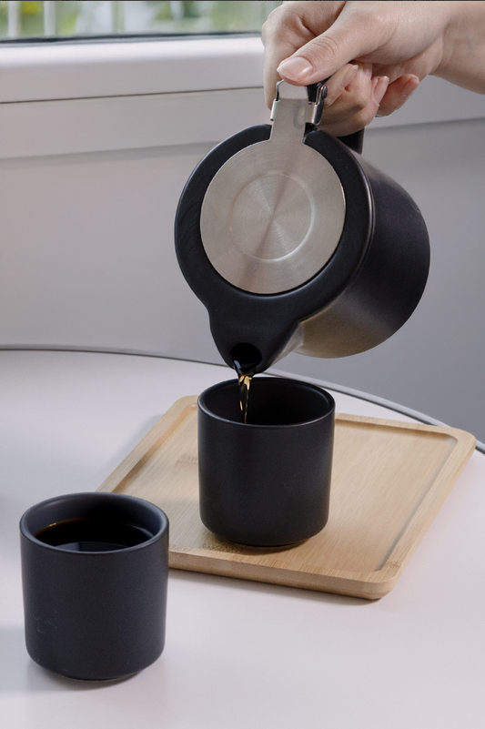 Vysoce kvalitní keramická čajová sada s matným povrchem a bambusovým servírovacím podnosem. Včetně konvice na čaj (500 ml) s víkem z nerezové oceli a sítkem na čaj a dvou šálků (150 ml). V krabičce z kraftového papíru. New. Vhodné do myčky nádobí: Ano. Vhodné do mirkovlnné trouby: Ne