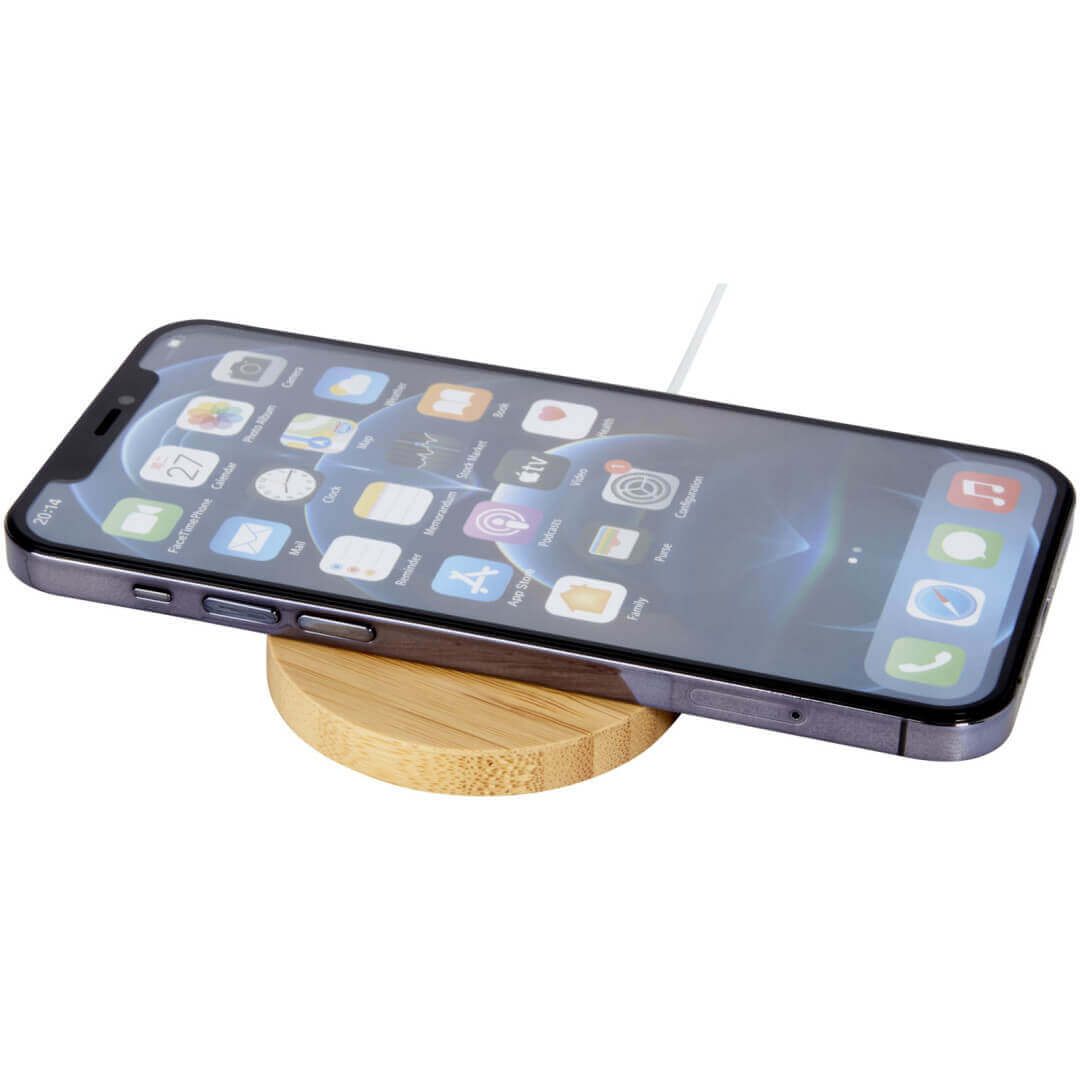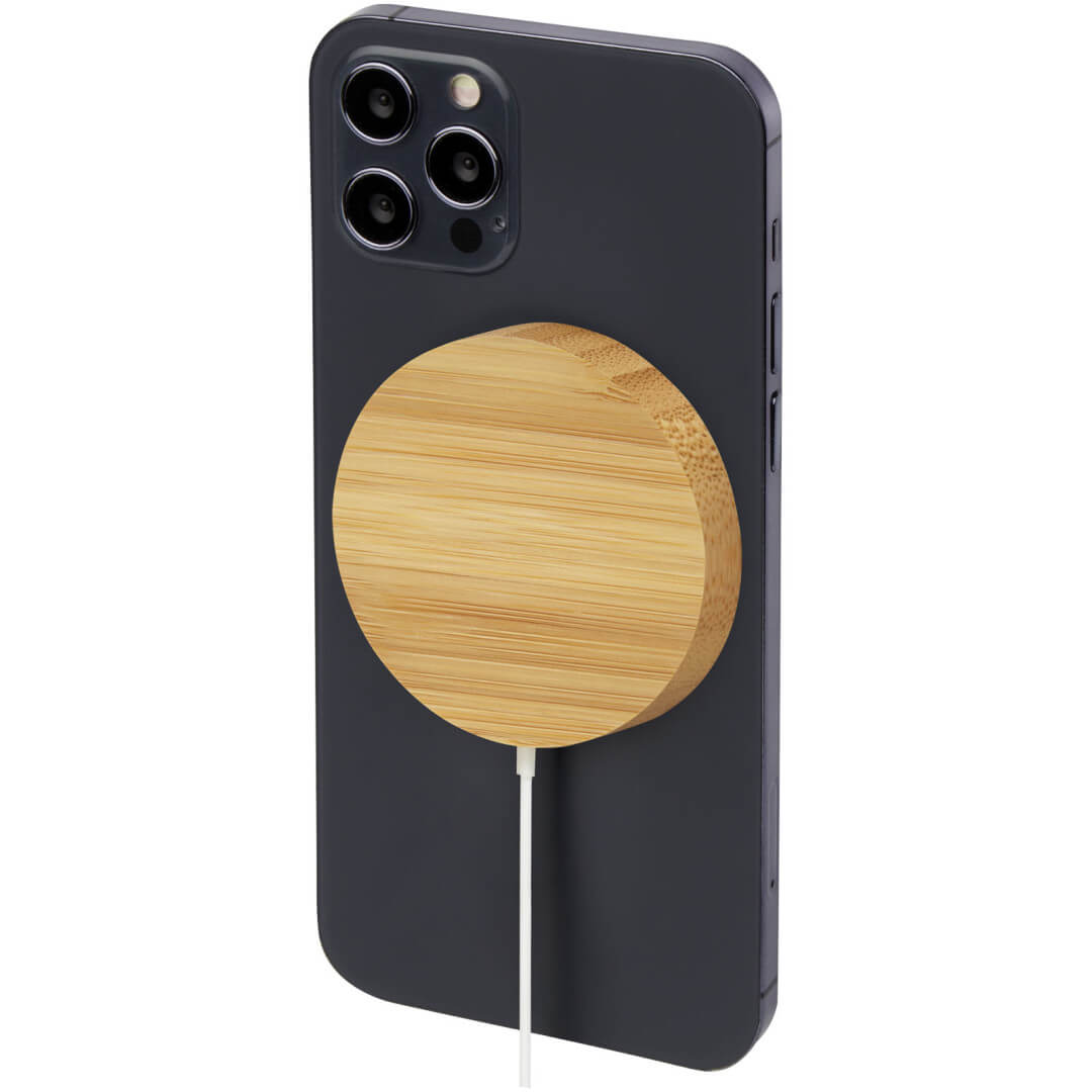 Bezdrátová magnetická bambusová nabíjecí podložka, kterou lze připojit k zadní části telefonu (iPhone 12 / iPhone 12 Pro / iPhone 12 Pro MAX) pro nabíjení zařízení. 10W bezdrátová nabíječka je kompatibilní se všemi zařízeními Qi (iPhone 8 nebo vyšší a zařízení Android, která podporují bezdrátové nabíjení). Pro ostatní telefony ji lze použít jako běžnou bezdrátovou nabíjecí podložku. Dodává se s přídavným kovovým kroužkem s dvojitou páskou, aby byla položka kompatibilní s jakýmkoli jiným chytrým telefonem, který má možnost bezdrátového nabíjení. Dodává se v dárkové krabičce včetně návodu (krabička i návod jsou vyrobené z udržitelných materiálů).