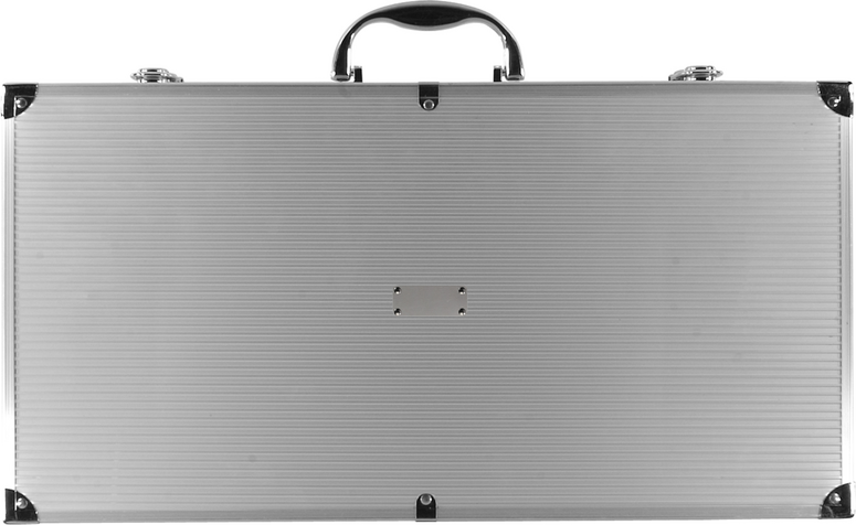 Gril z nerezové oceli v hliníkovém pouzdře s osmi špízy, čtyřmi ražemi, štětcem, měkkým kartáčem, řezbářským nožem, řezbářskou vidličkou, špachtlí s řezacím nožem a kleštěmi.