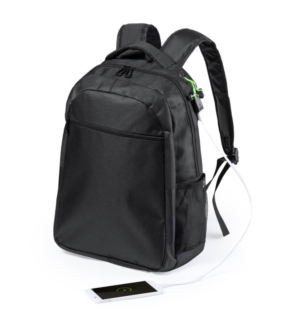 Voděodolný batoh s příhrádkami na zip, vypolstrovanou příhrádkou na laptop a tablet, vypolstrované ramenní popruhy. Výstup na sluchátka a s vestavěným USB připojením pro power banku. 600D polyester.