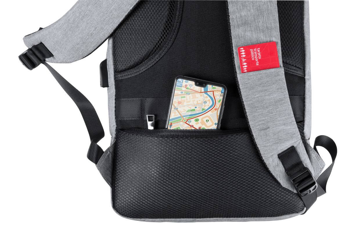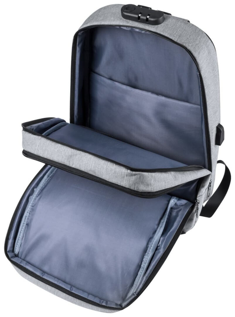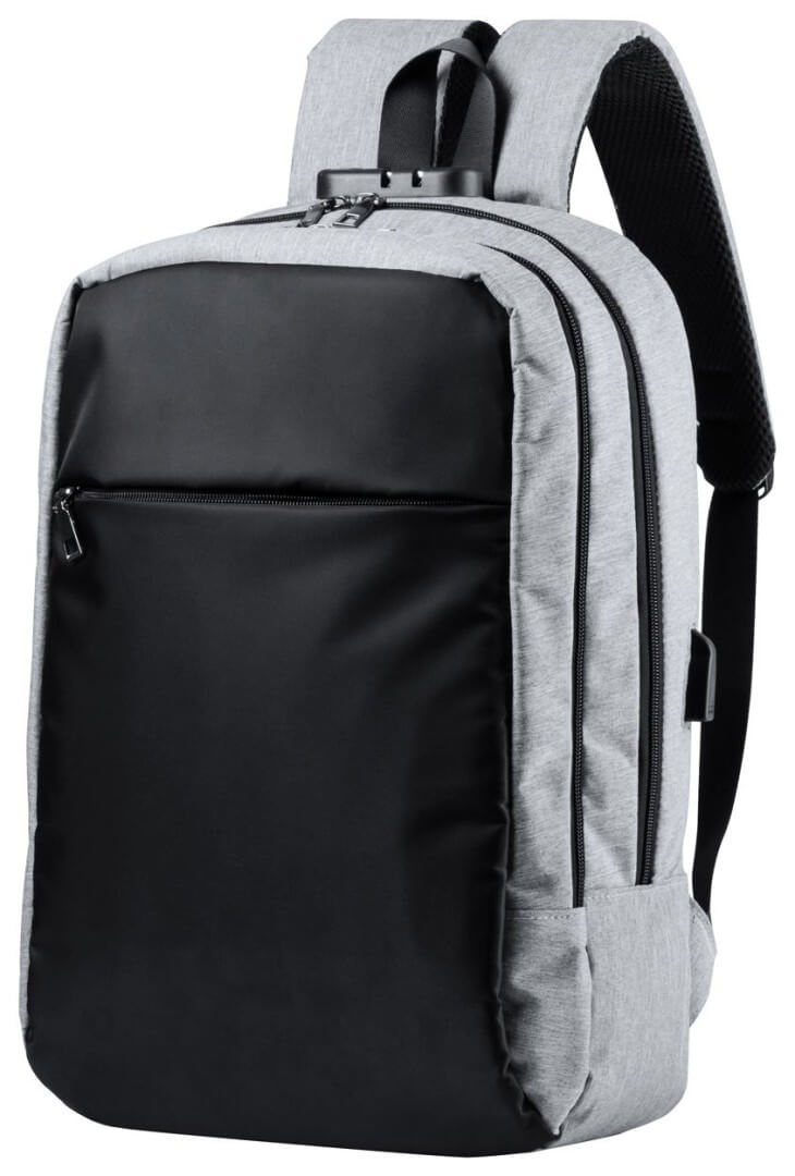 Voděodolný batoh s mnoha přihrádkami na zip, vypolstrovanou přihrádkou na laptop, vypolstrovanými zády a ramenními popruhy. S vestavěným USB připojením pro power banku a bezpečnostním zámkem. 300D polyester.