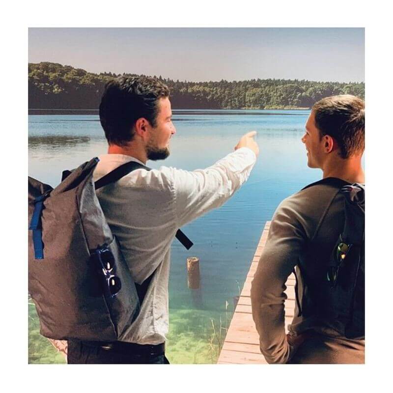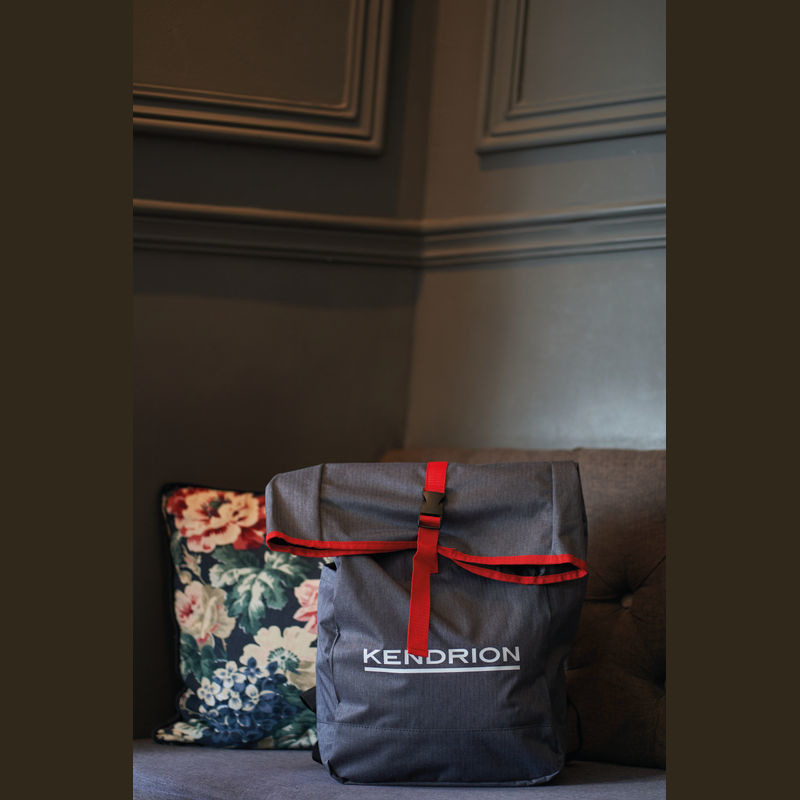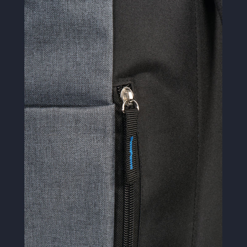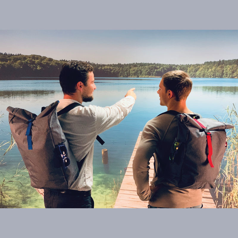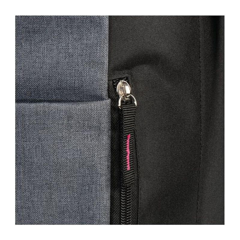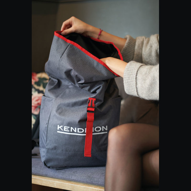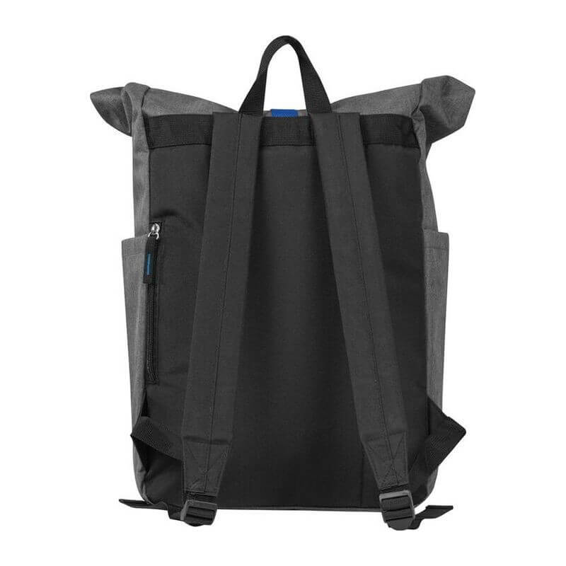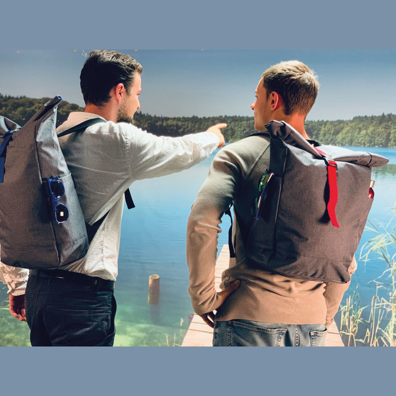 Stylový batoh v šedé barvě zvýrazněn barevným pásem na uzavření, s vyztuženými popruhy z polyesteru. Batoh se dá bezpečně uzavřít jednoduchým zkroucením nebo naskládáním.