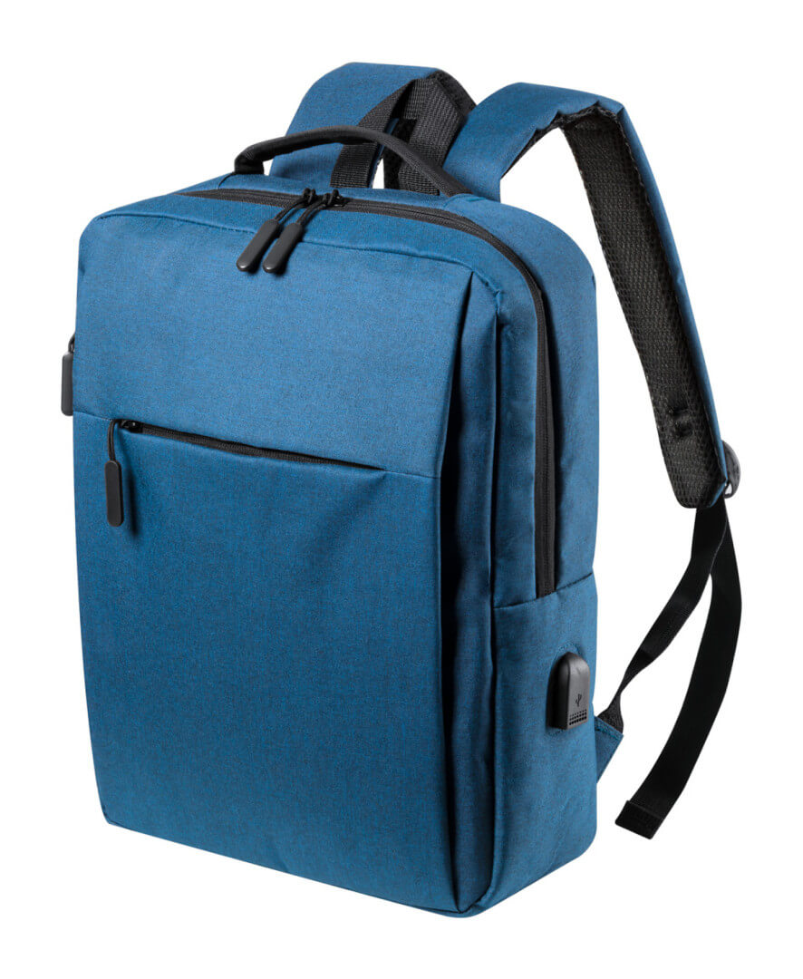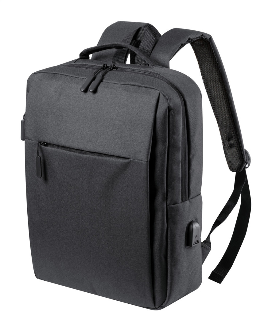 Batoh s více přihrádkami na zip, polstrovanou přihrádkou na notebook, polstrovanými zády a ramenními popruhy. S popruhem na vozík a vestavěným USB připojením pro power banky. Polyester 600D.