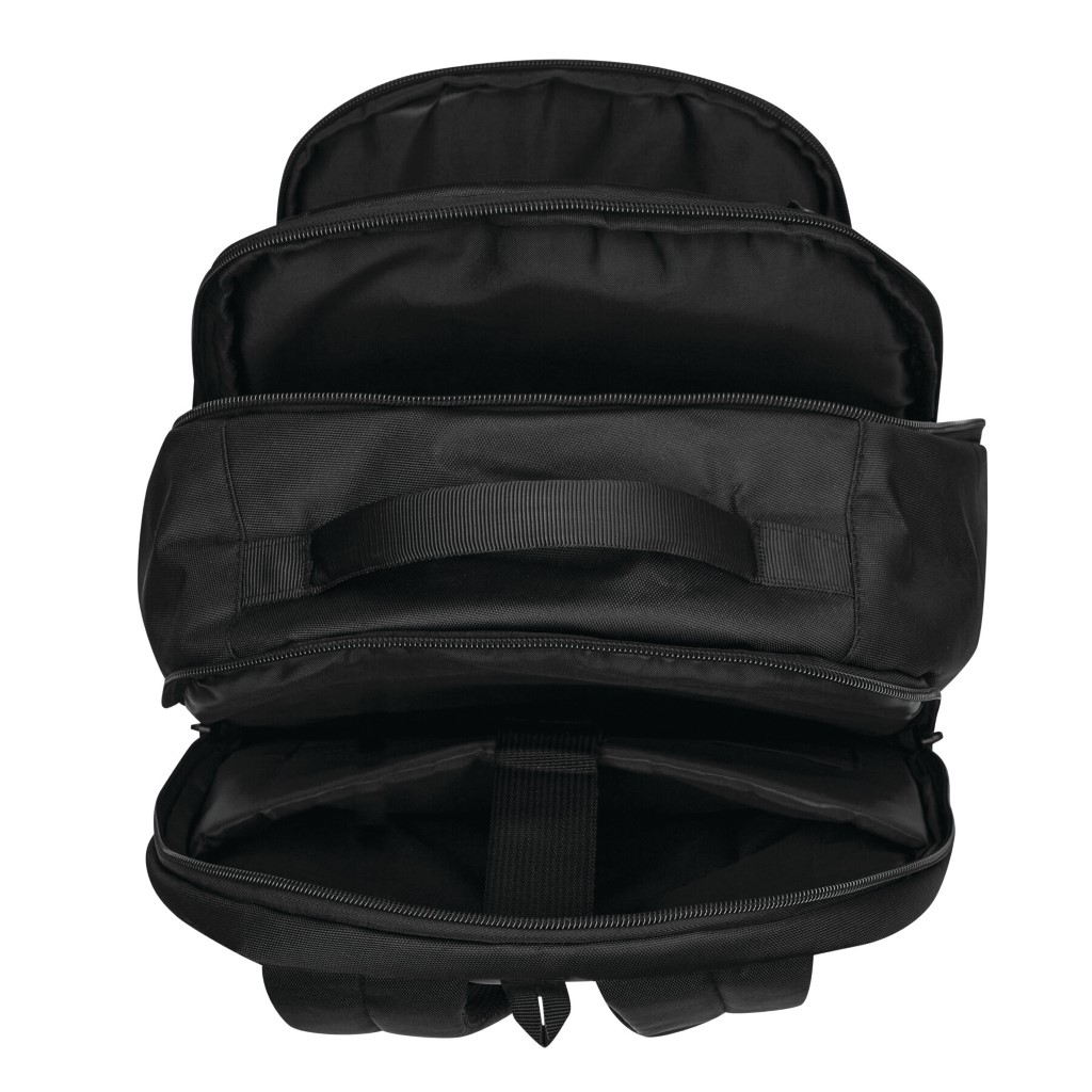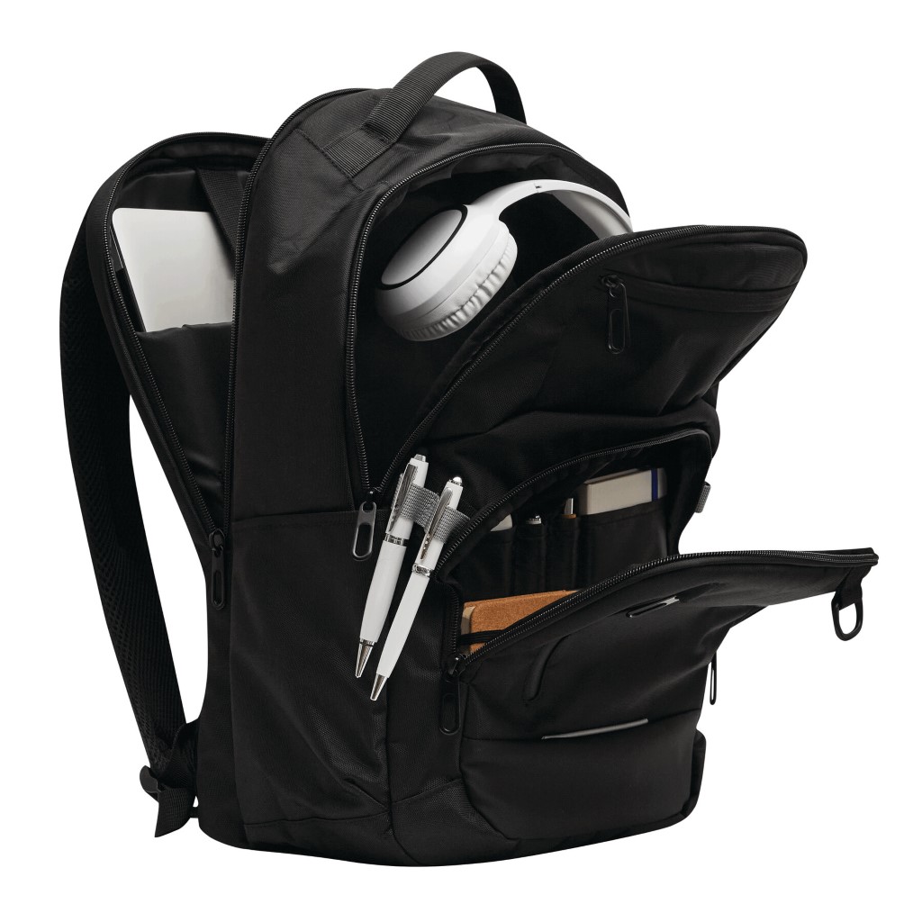 Batoh AARHUS: 1 přední přihrádka na zip s organizérem, 1 přední kapsa na svislý zip, 1 přední kapsa na vodorovný zip se sametovou podšívkou (ideální na chytrý telefon apod.), reflexní proužek, 2 násuvné kapsy po stranách, 2 hlavní přihrádky na zip, jedna s polstrovanou přihrádkou na notebook nebo tablet a další násuvnou kapsou, polstrované madlo a malé poutko na zavěšení, s D-kroužkem a úchyty na pera, ergonomicky tvarované polstrované ramenní popruhy a polstrovaný zádový panel - výrobek značky Nordic plains