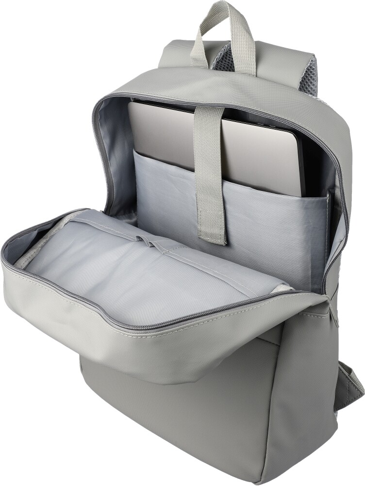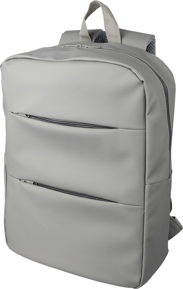 PU batoh na notebook (15 palců) se dvěma předními kapsami na zip, velkou přihrádkou na zip s částí na notebook uzavřenou na Velcro a několika kapsami uvnitř. Větraná polstrovaná zadní část s popruhem pro připevnění na kufr a nastavitelnými ramenními popruhy. Odpuzuje vodu.Rozměry: 12,5 x 30 x 41,5 cm