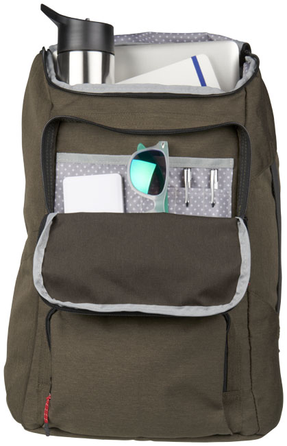Batoh na notebook Datson 17". Batoh na notebook určený ke každodennímu použití. Obsahuje pouzdro na 17” notebook v hlavní přihrádce, kapsu na zip se snadným přístupem v přední klopě a přední kapsu na zip s dělenými kapsami. Tento batoh obsahuje vylepšení jako vysoce kvalitní potištěný materiál, potištěné obložení vnitřku, vinylový upínací pásek a zaměnitelné stahováky na zip. Díky přidaným funkcím jako síťovaná kapsa na láhev s vodou a silikonová rukojeť ve spodní části je tento batoh velmi žádaným produktem. 600D Polycanvas.