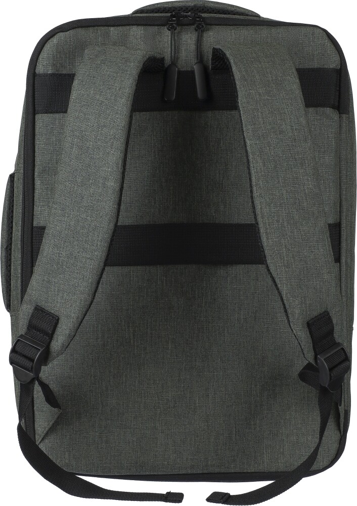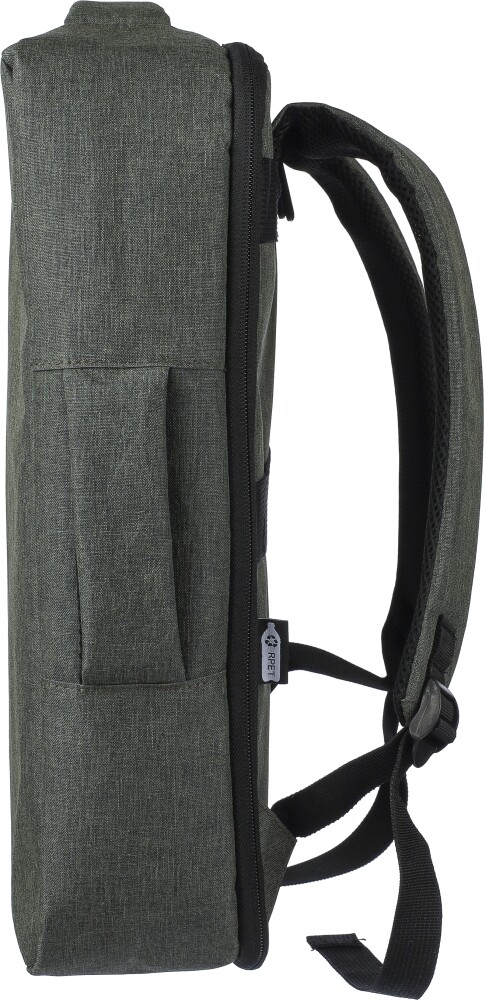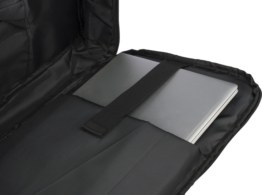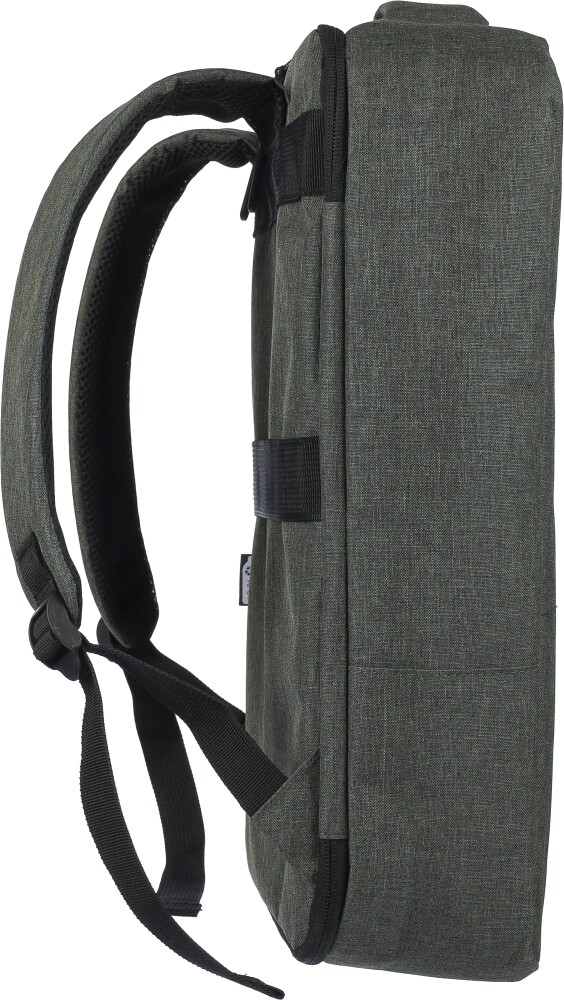 Batoh na notebook z polyesteru rPET 300D s podšívkou z rPET 210D. Má velkou přihrádku na zip s několika vloženými kapsami, kapsu na suchý zip pro 15palcový notebook a objem 12 litrů. Design zahrnuje zesílenou, odvětrávanou zadní stranu, nastavitelné ramenní popruhy, boční rukojeť a popruh na kolečkách. Nosnost: 10 kg. Rozměry: 30 x 11 x 42 cm