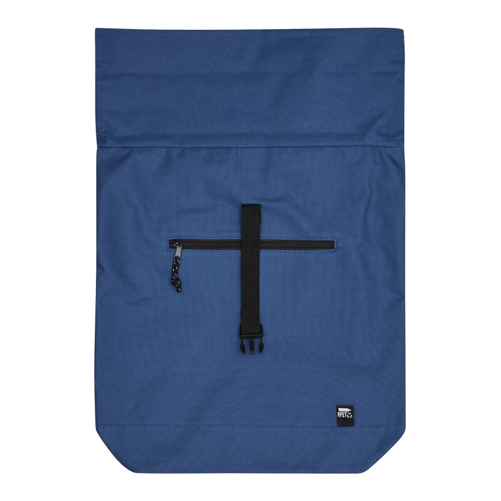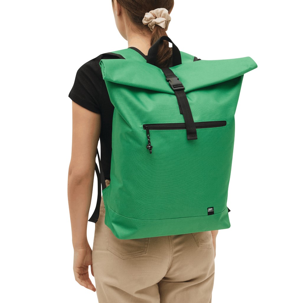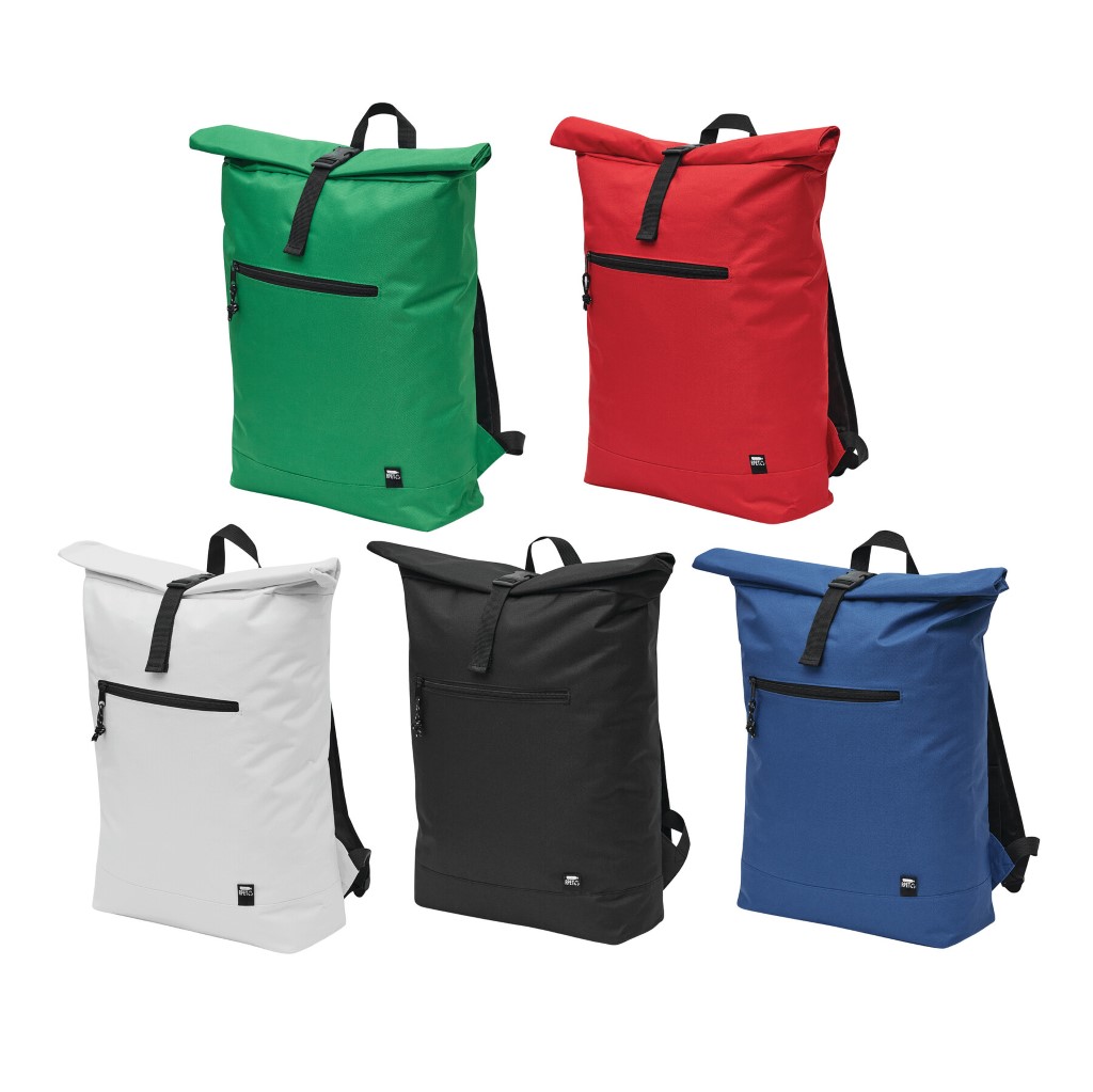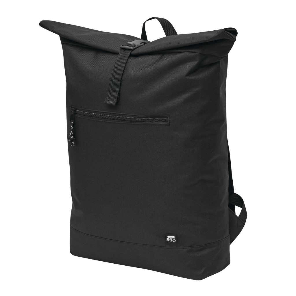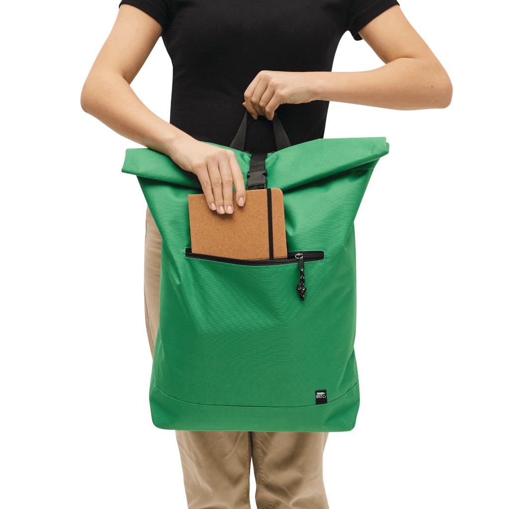 Batoh ROLL-TOP: vyroben z recyklovaného plastu (RPET), přední přihrádka na zip, velká hlavní přihrádka s polstrovanou vnitřní přihrádkou na notebook nebo tablet, horní část lze srolovat a zapnout na patentku, madlo, polstrované dno, ramenní popruhy, zádový panel