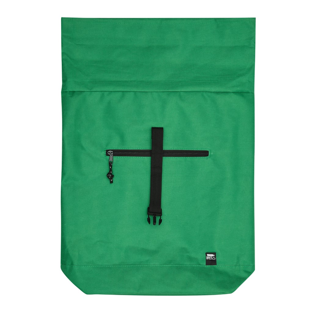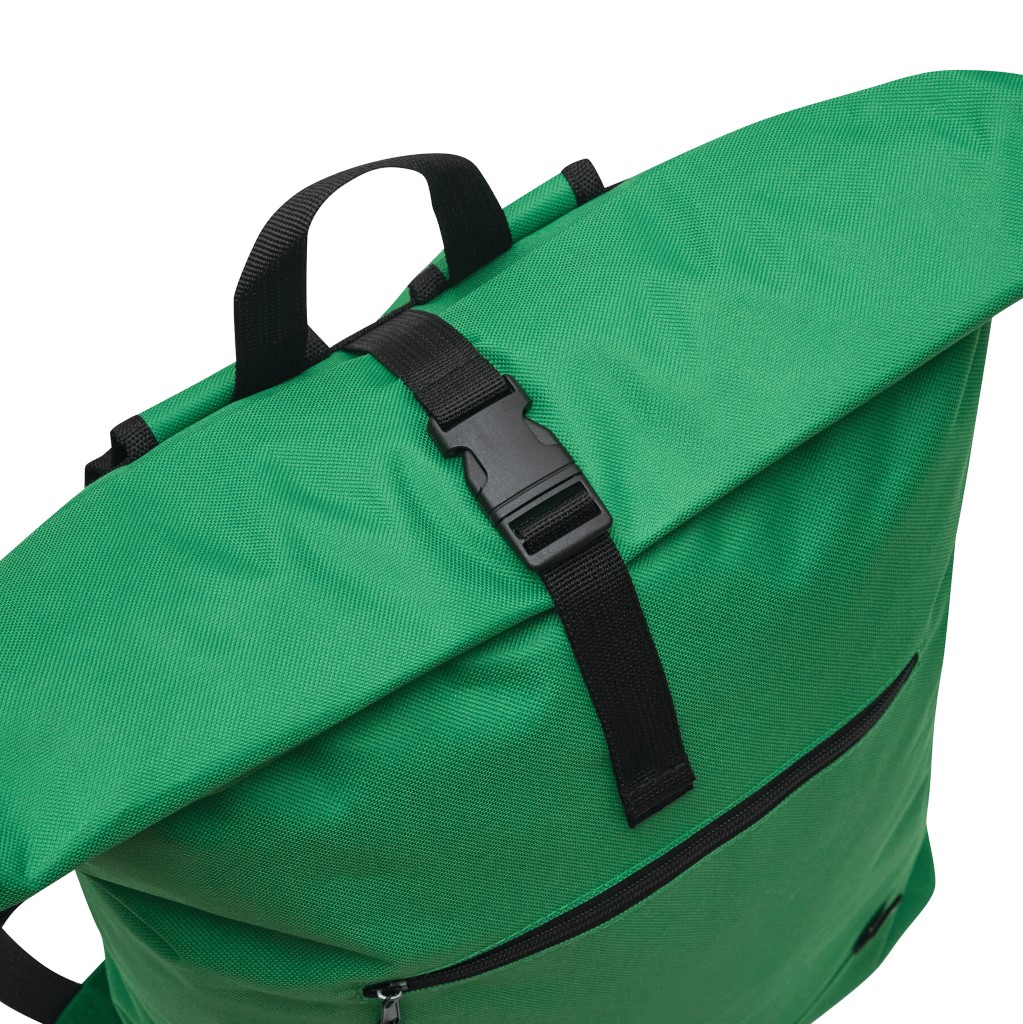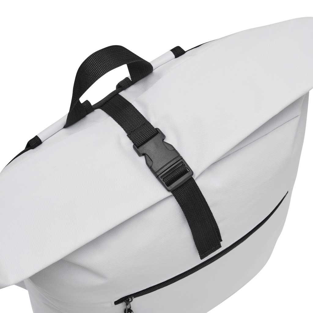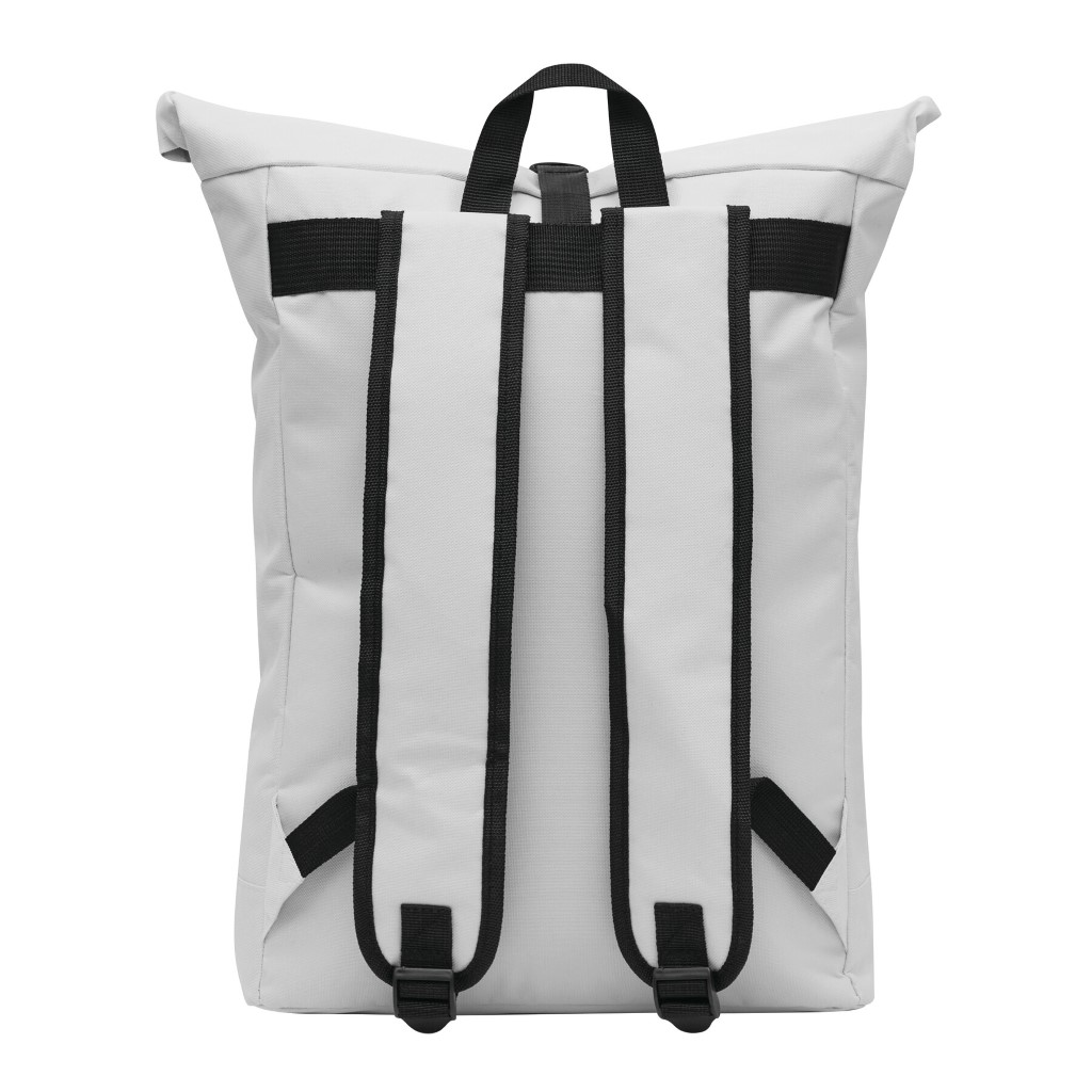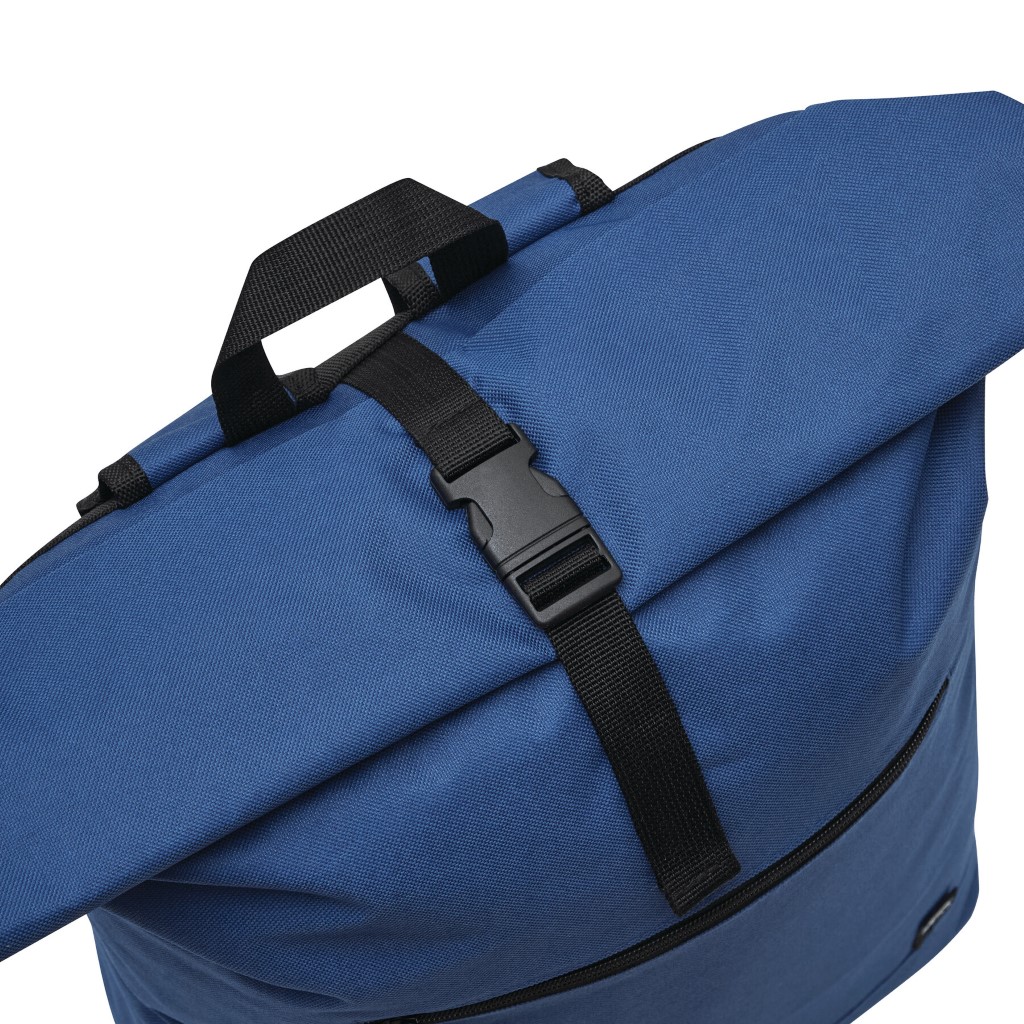 Batoh ROLL-TOP: vyroben z recyklovaného plastu (RPET), přední přihrádka na zip, velká hlavní přihrádka s polstrovanou vnitřní přihrádkou na notebook nebo tablet, horní část lze srolovat a zapnout na patentku, madlo, polstrované dno, ramenní popruhy, zádový panel