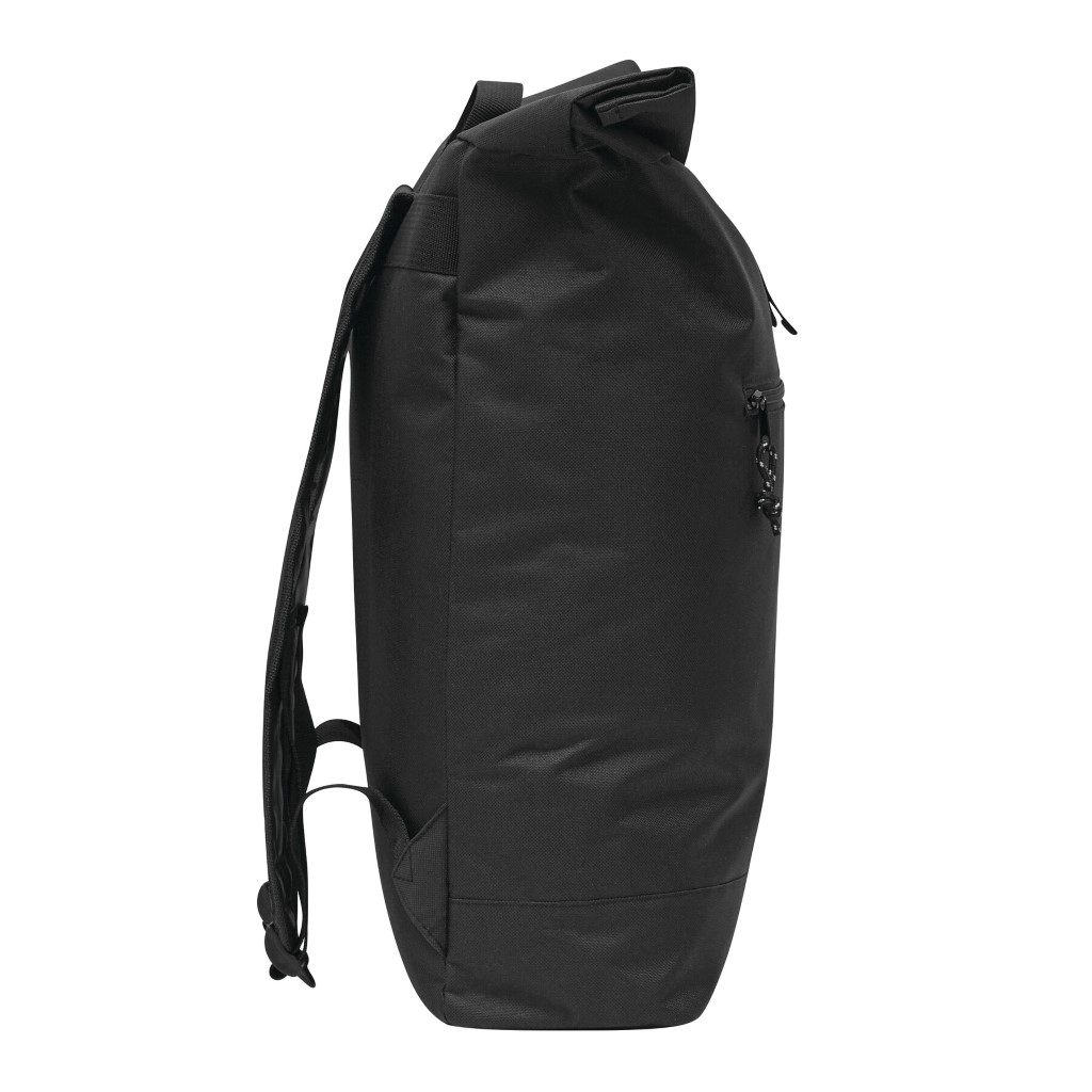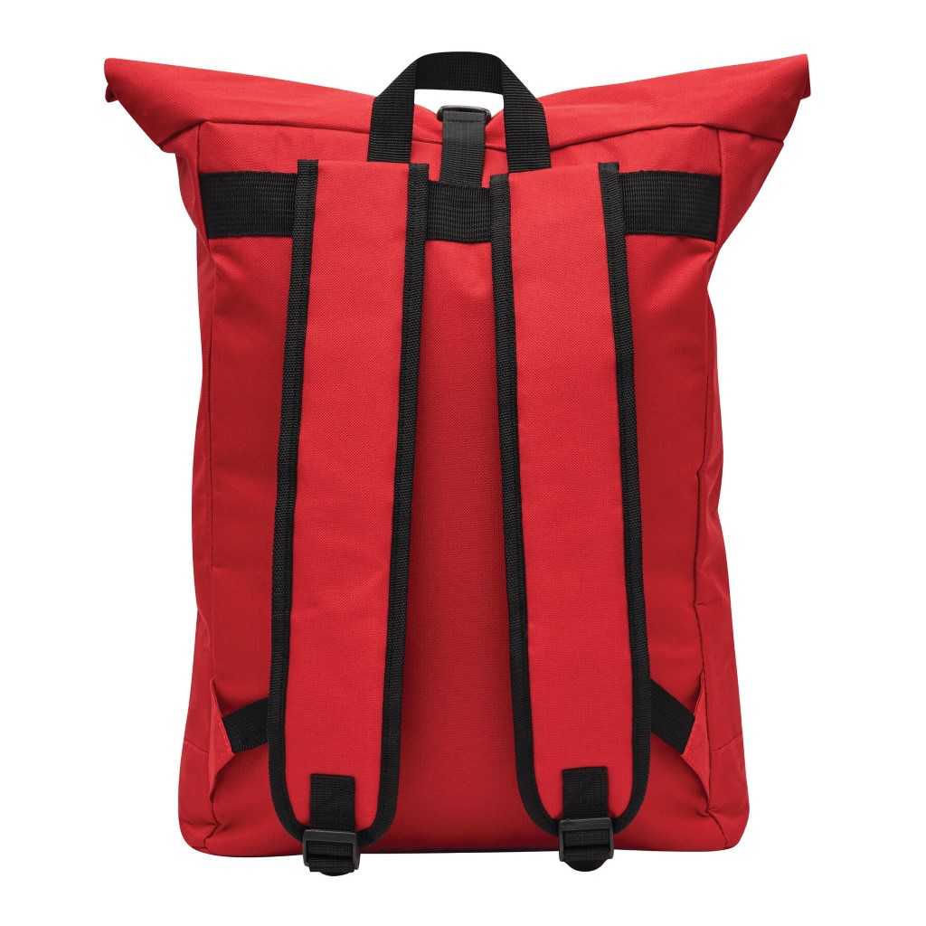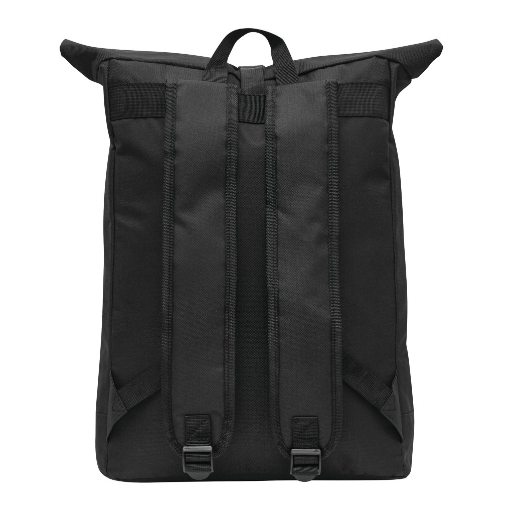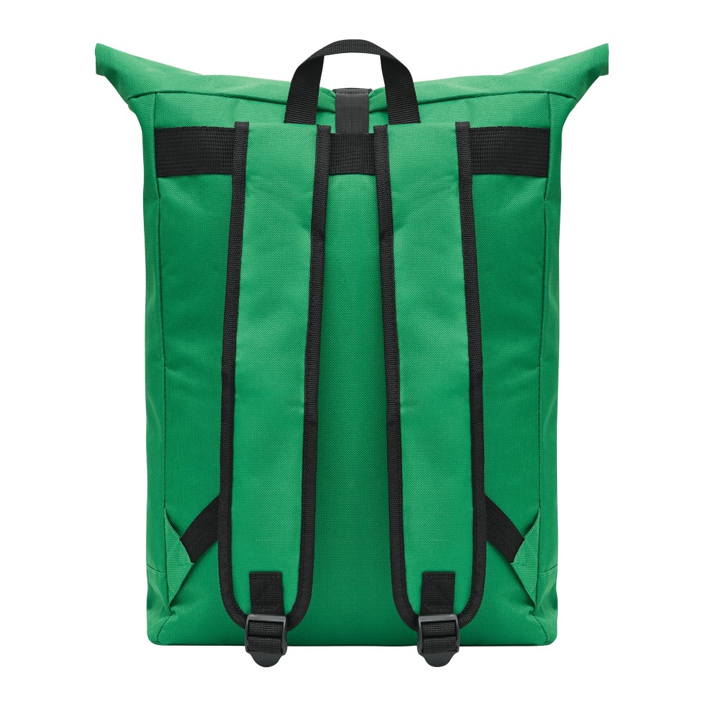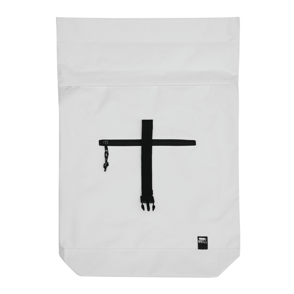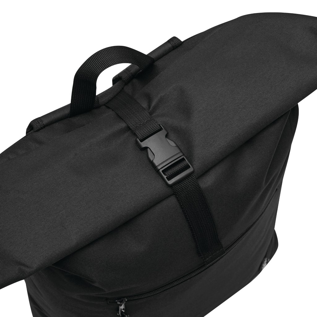 Batoh ROLL-TOP: vyroben z recyklovaného plastu (RPET), přední přihrádka na zip, velká hlavní přihrádka s polstrovanou vnitřní přihrádkou na notebook nebo tablet, horní část lze srolovat a zapnout na patentku, madlo, polstrované dno, ramenní popruhy, zádový panel