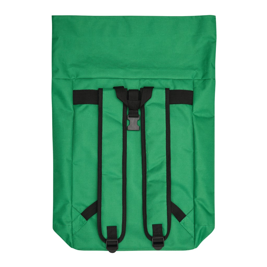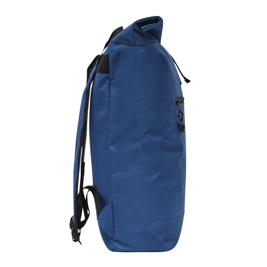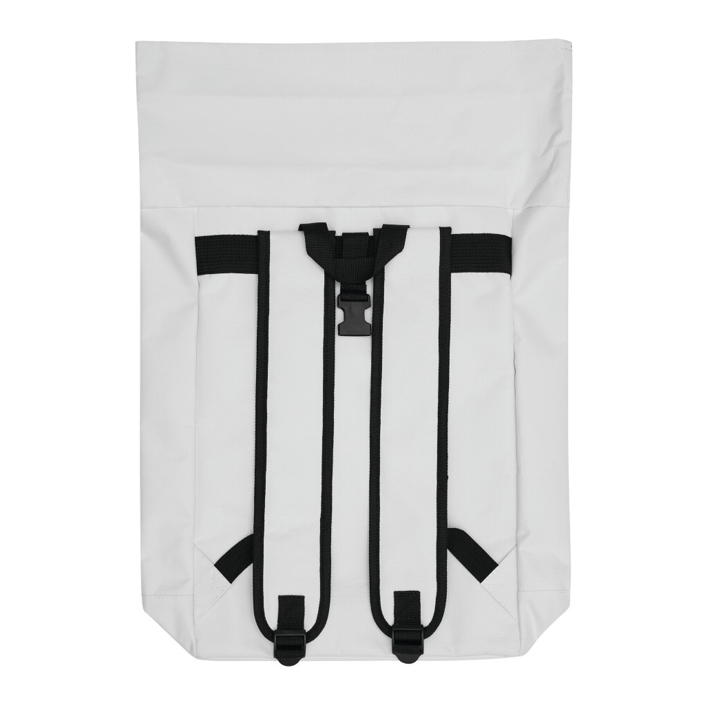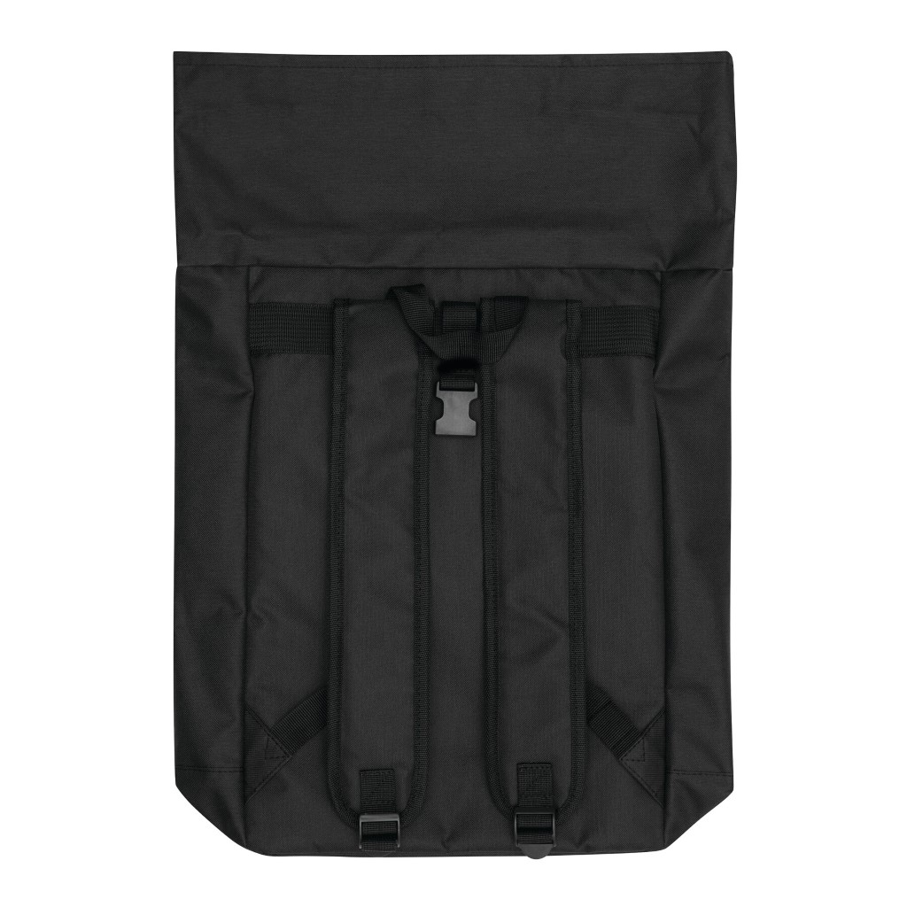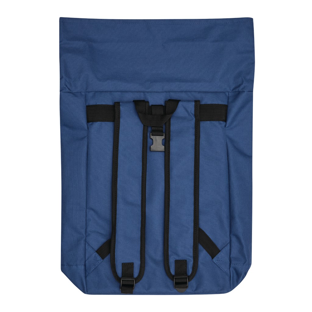Batoh ROLL-TOP: vyroben z recyklovaného plastu (RPET), přední přihrádka na zip, velká hlavní přihrádka s polstrovanou vnitřní přihrádkou na notebook nebo tablet, horní část lze srolovat a zapnout na patentku, madlo, polstrované dno, ramenní popruhy, zádový panel