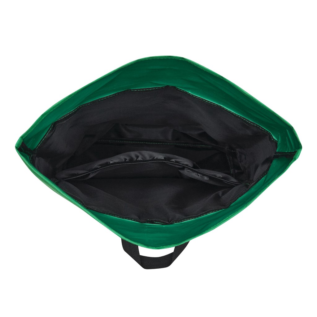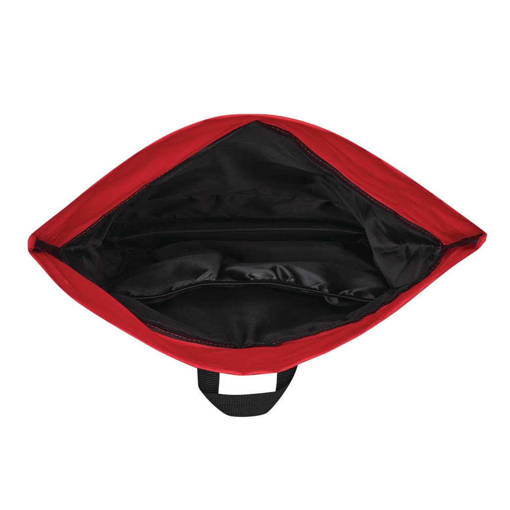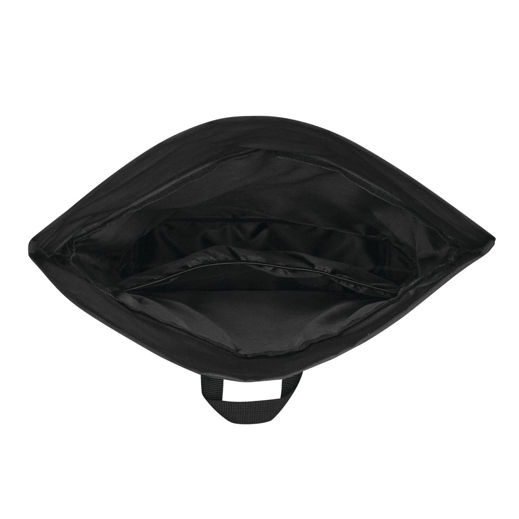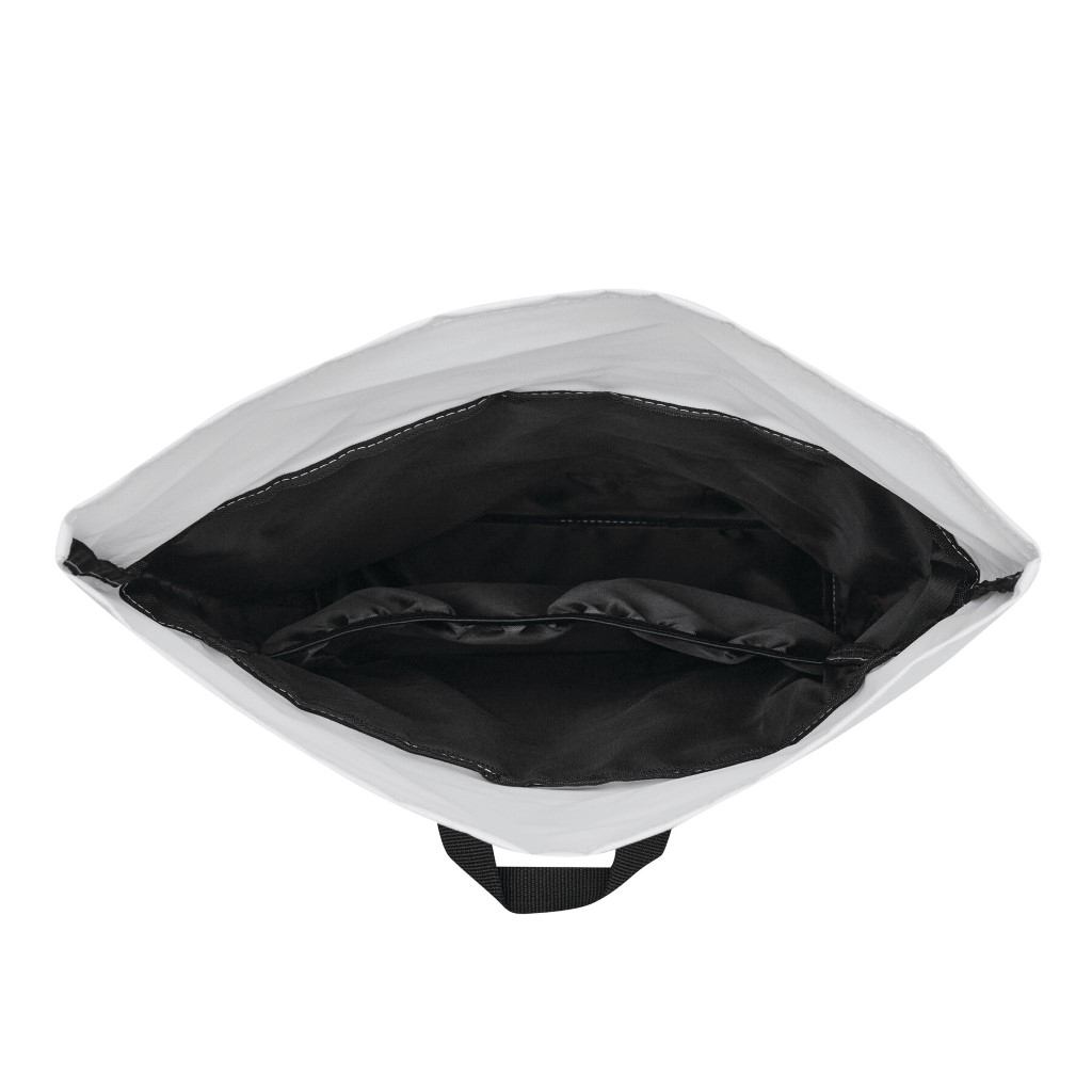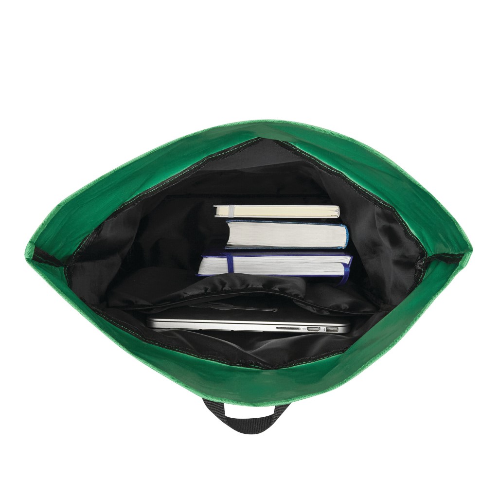 Batoh ROLL-TOP: vyroben z recyklovaného plastu (RPET), přední přihrádka na zip, velká hlavní přihrádka s polstrovanou vnitřní přihrádkou na notebook nebo tablet, horní část lze srolovat a zapnout na patentku, madlo, polstrované dno, ramenní popruhy, zádový panel