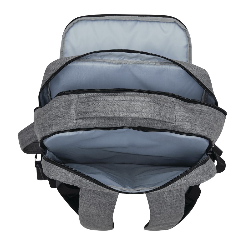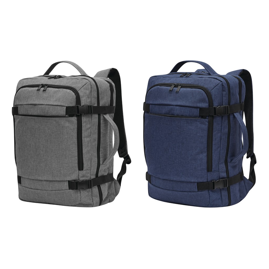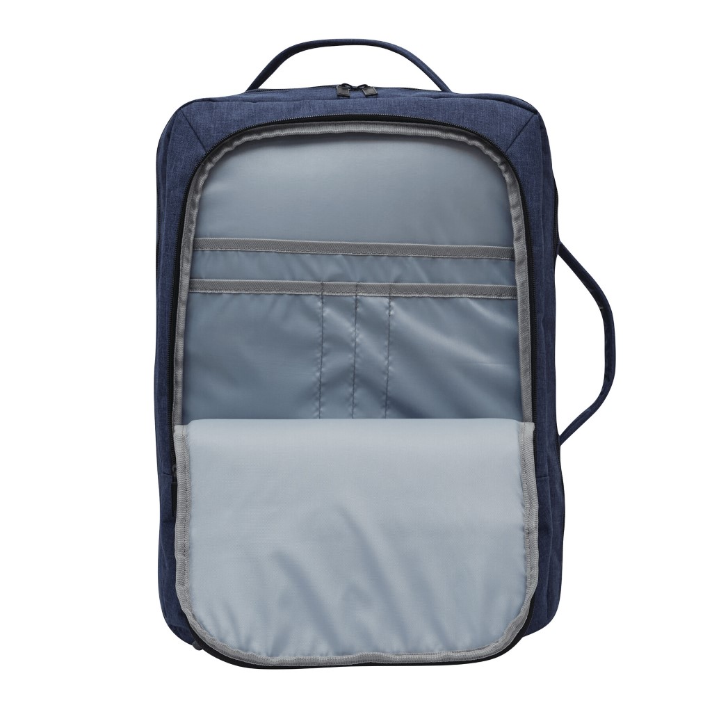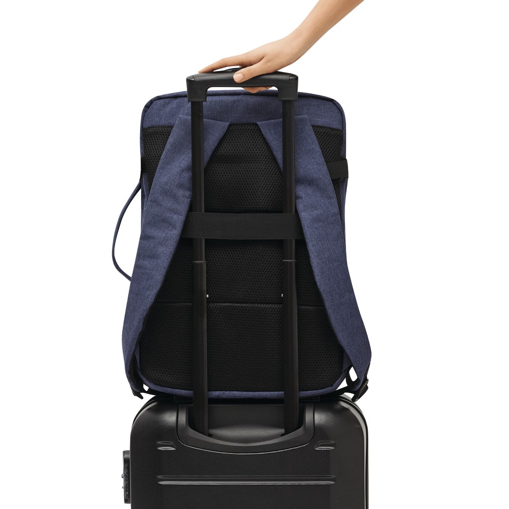 Batoh STEWARD: 2 přední přihrádky na zip, jedna s organizérem (3 zasouvací kapsy, 2 poutka na tužky), 1 velká polstrovaná hlavní přihrádka s balicím popruhem a zipem, 1 polstrovaná přihrádka na notebook se zipem, 1 vyztužené horní a boční madlo, polstrované ergonomické ramenní popruhy a polstrovaný zádový panel s pouzdrem na kolečkách, 2 kompresní popruhy se zapínáním na patentky na každé straně.