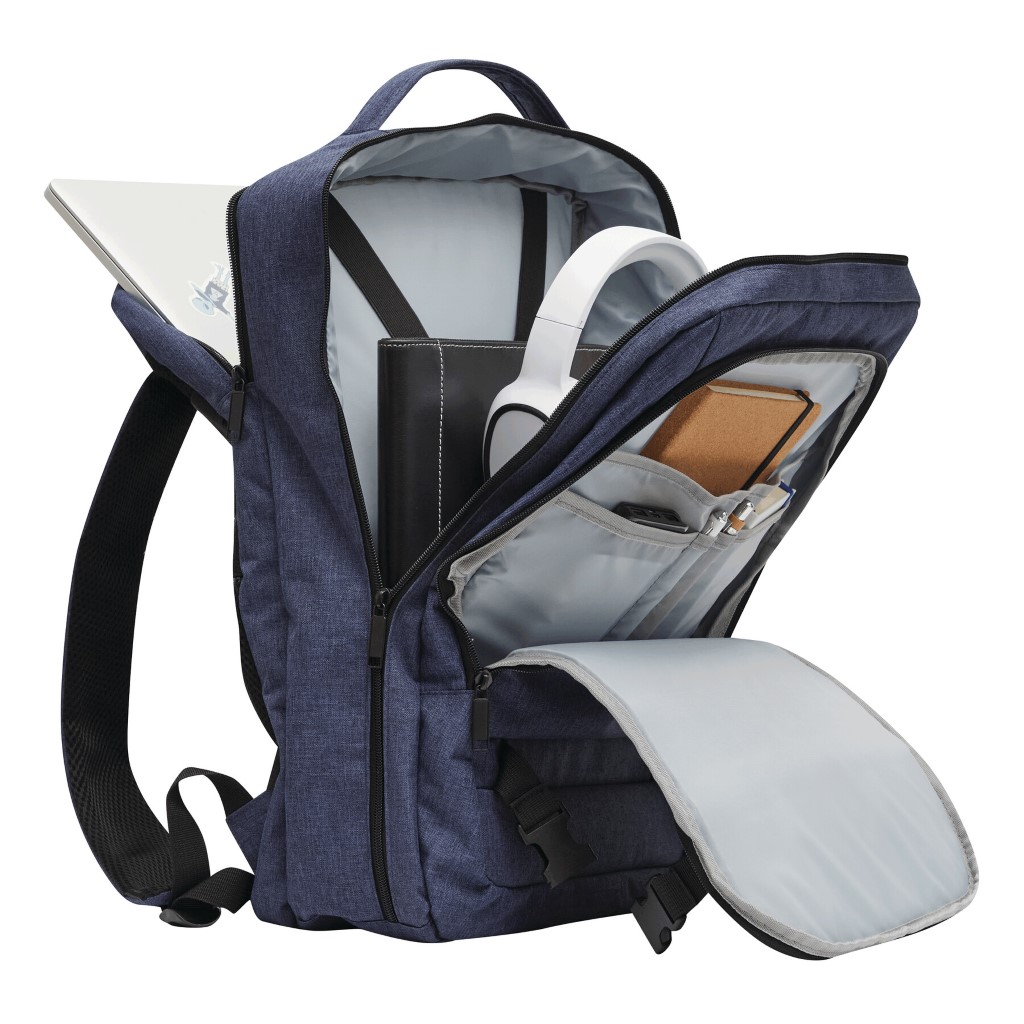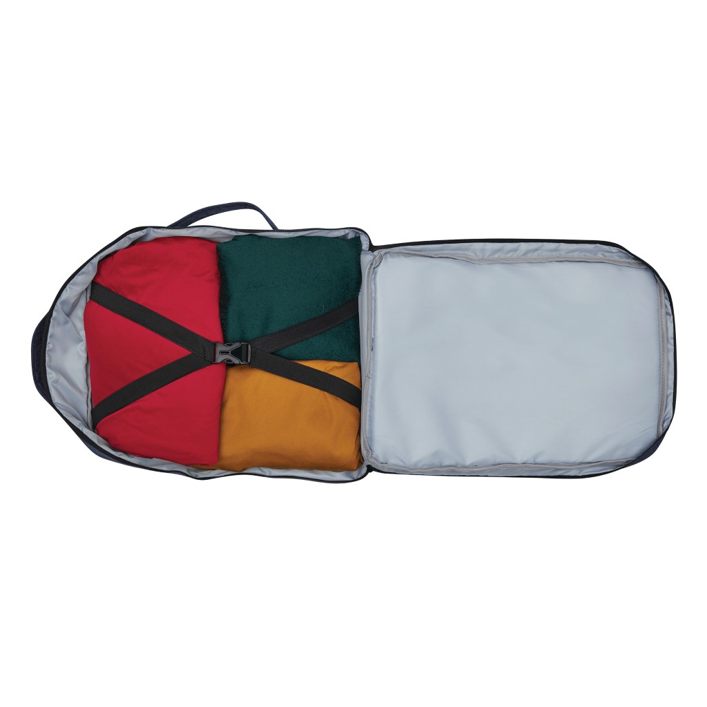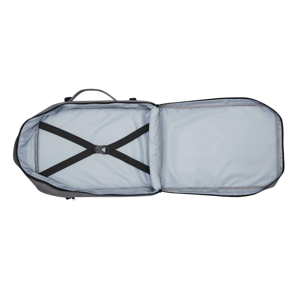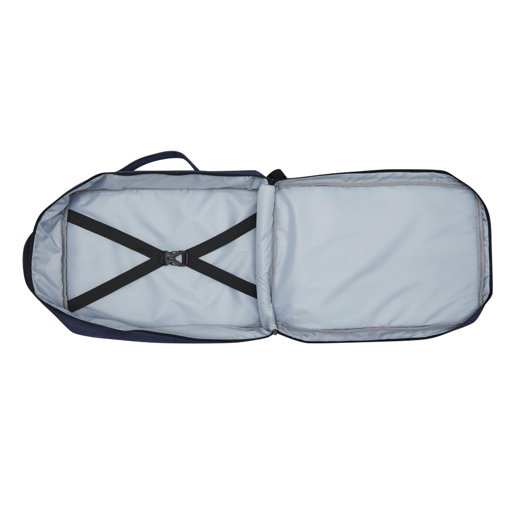 Batoh STEWARD: 2 přední přihrádky na zip, jedna s organizérem (3 zasouvací kapsy, 2 poutka na tužky), 1 velká polstrovaná hlavní přihrádka s balicím popruhem a zipem, 1 polstrovaná přihrádka na notebook se zipem, 1 vyztužené horní a boční madlo, polstrované ergonomické ramenní popruhy a polstrovaný zádový panel s pouzdrem na kolečkách, 2 kompresní popruhy se zapínáním na patentky na každé straně.
