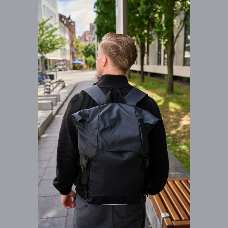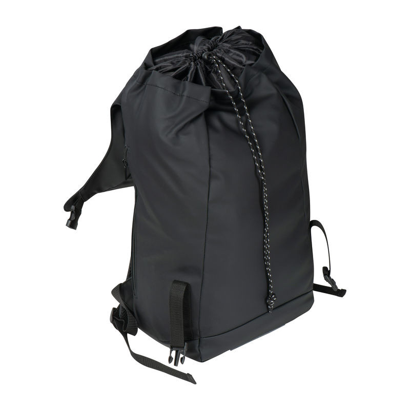 Velký polyesterový batoh s vodoodpudivým PU povrchem. Má prostornou hlavní přihrádku s kapsou na notebook a vyztuženými zády, jakož i dvě kapsy na zip na pravé a levé vnější straně. Uzavírá se pomocí šňůrky a chlopní, která udrží obsah suchý během deště.