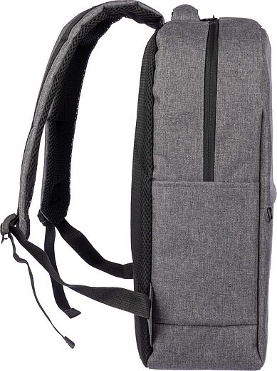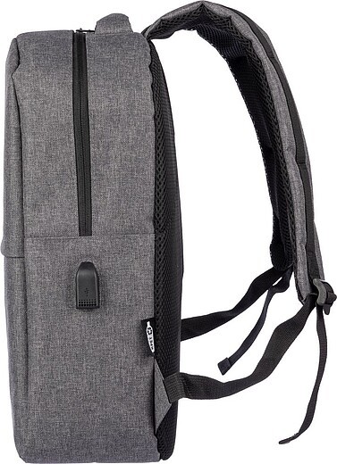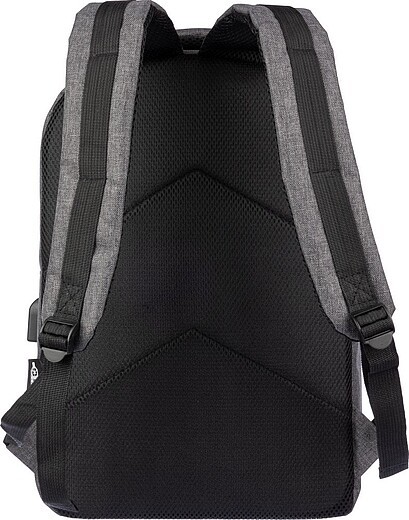 Batoh rPET s otvorem pro USB port (a USB kabelem uvnitř) s velkou přihrádkou na zip na horní straně a kapsou na zip na přední straně. Uvnitř je přihrádka pro 10palcová zařízení a jedna pro 15palcová zařízení. S nastavitelnými rukojeťmi. Materiál: RPET. Rozměry: 29 x 13 x 43 cm