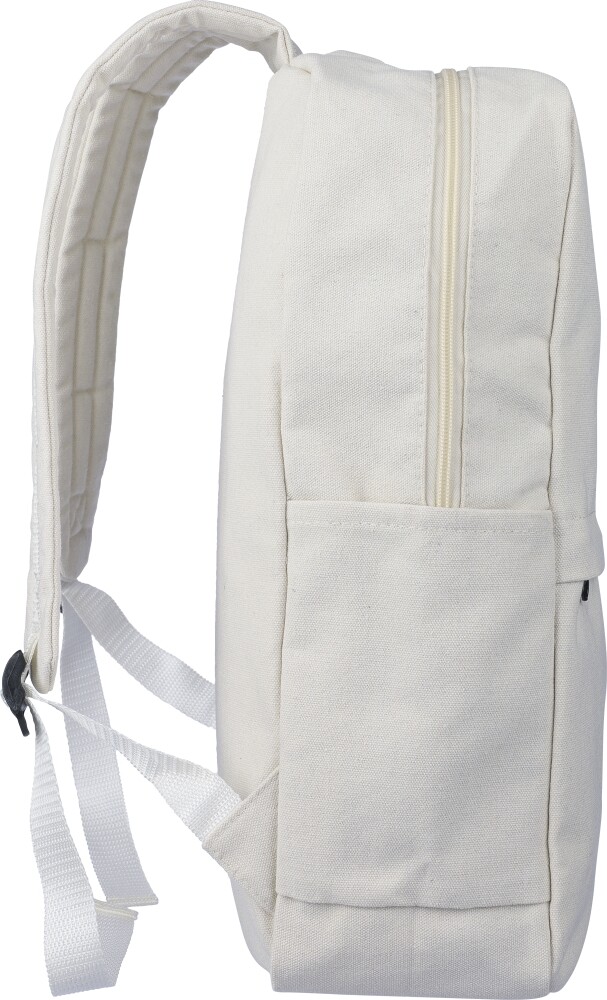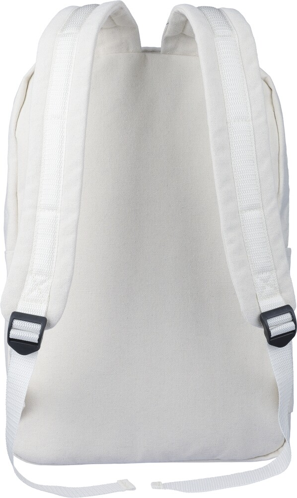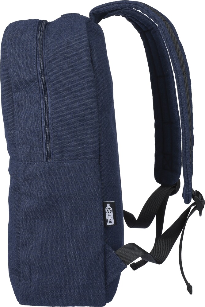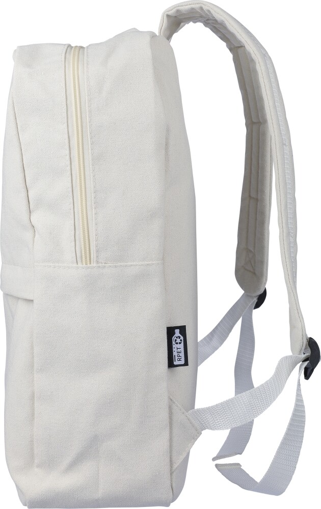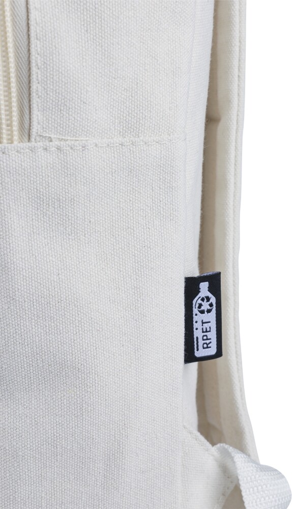Batoh z recyklované polybavlny (330 g/m2) s podšívkou z polyesteru 210D. Má velkou přihrádku na zip s polstrovanou přihrádkou na 15palcový notebook, dvě vnitřní přihrádky a dvě vnější přihrádky, včetně boční přihrádky a malé přední kapsy na zip. Design zahrnuje polstrované nastavitelné popruhy a rukojeť. Kapacita: 14 l. Nosnost: 13 kg. Rozměry: 28 x 12 x 43 cm