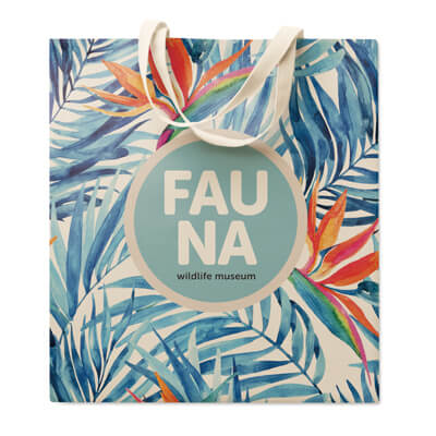 Bavlněná celopotisknutelná nákupní taška na míru s dlouhými držadly. Tašku lze plnobarevně celoplošně potisknout. Rozměry: 38x42cm; ručky 70x2cm. Taška je dostupná v různých gramážích bavlny, 140 g/m2, 180 g/m2, 280 g/m2 nebo můžete zvolit bambusovou látku. Je možné vybrat také krátké rukojeti či jinou velikost tašky. Taška může mít také zavírání na zip nebo kovový knoflík za příplatek.