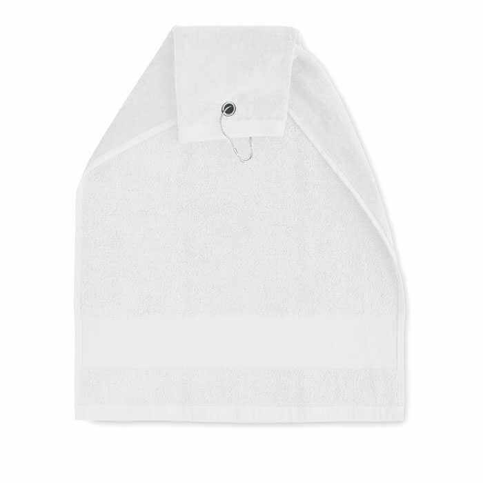 Bavlněný golfový ručník s měděným otvorem a kroužkem na horní straně, který lze použít k zavěšení na golfový bag. Gramáž 350 gr/m². Velikost ručníku: 40x60 cm. Tento golfový ručník používejte k osušení golfových míčků, holí nebo rukou. Zlepšete přilnavost otřením svého vybavení do sucha a udržujte je v perfektním stavu.