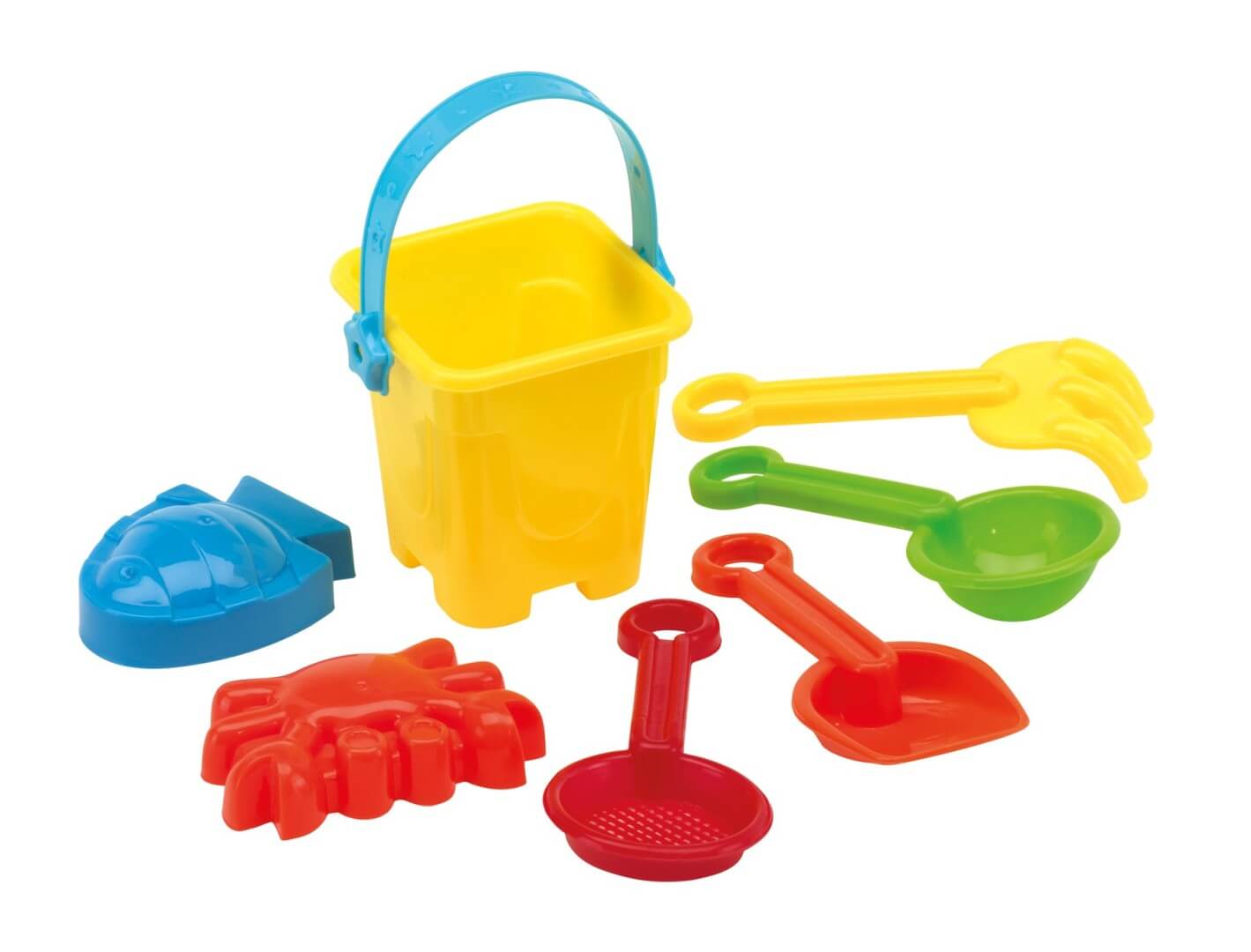 Kbelík na písek - Set Beachlife Skládá se ze 7 ks hraček: kbelík na písek s rukojetí, 6 různých formiček, lopatka a hrábě; kbelík a obsah je v různých barvách a tvarech. Baleno v sáčku ze síťoviny.