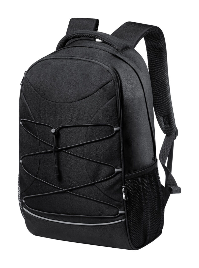 Batoh RPET s přihrádkami na zip, bočními kapsami ze síťoviny, elastickými šňůrkami vpředu, polstrovanou přihrádkou na notebook (15") a tablet (12"), polstrovaná záda a ramenní popruhy. S výrazným štítkem RPET. Polyester 600D RPET.