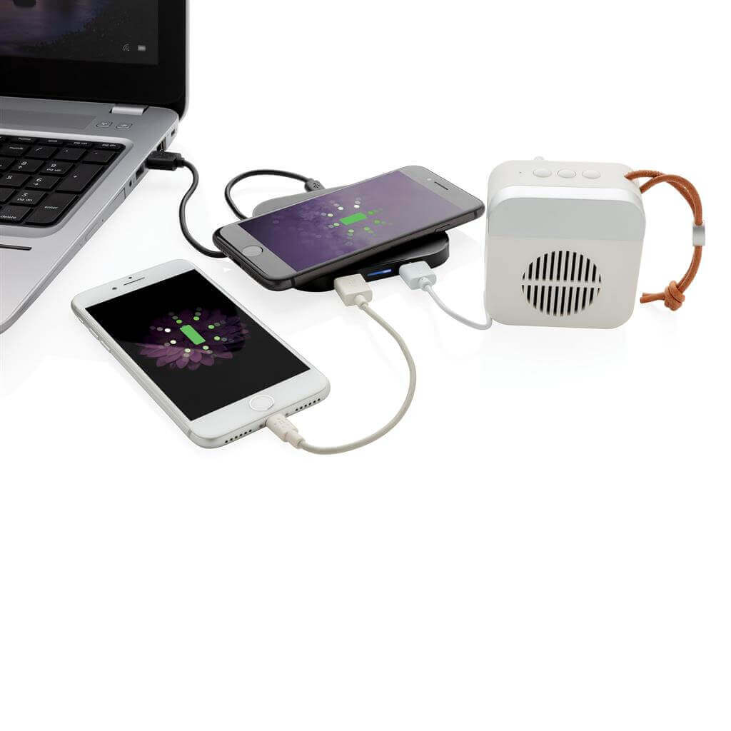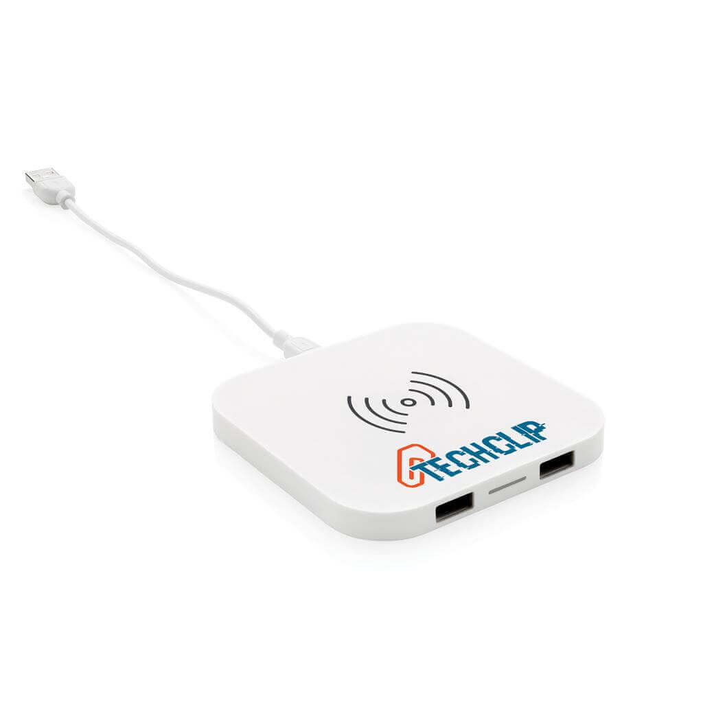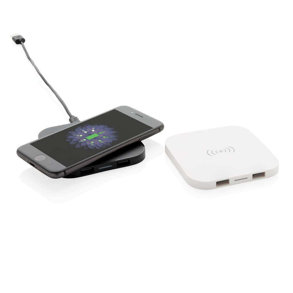 Bezdrátová nabíječka s výkonem 5W vhodná pro nabíjení telefonů podporujících QI jako jsou nejnovější generace Android, iPhone 8 a výše. Díky 2 USB výstupům je možné nabíjet i jakákoliv jiná zařízení nepodporujících QI. Vyrobeno z ABS. Vhodná pouze pro nabíjení, nikoli pro datový přenos. Vstup: 5V/1A. Výstup USB: 5V/1A. Bezdrátový výstup: 5V/1A 5W.