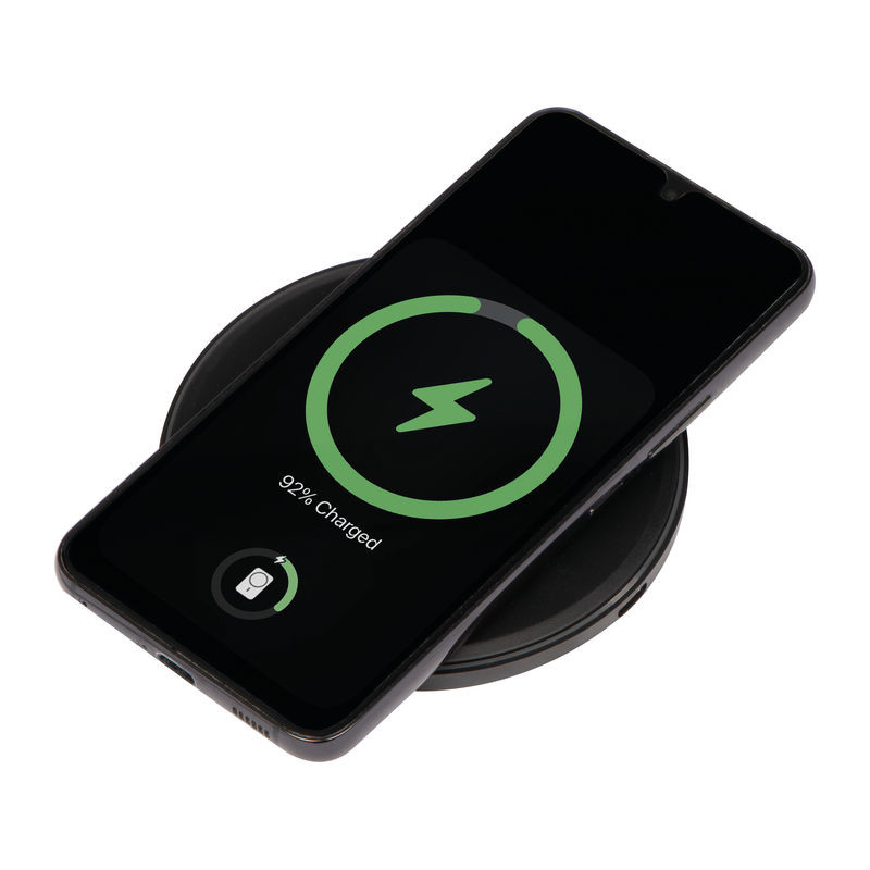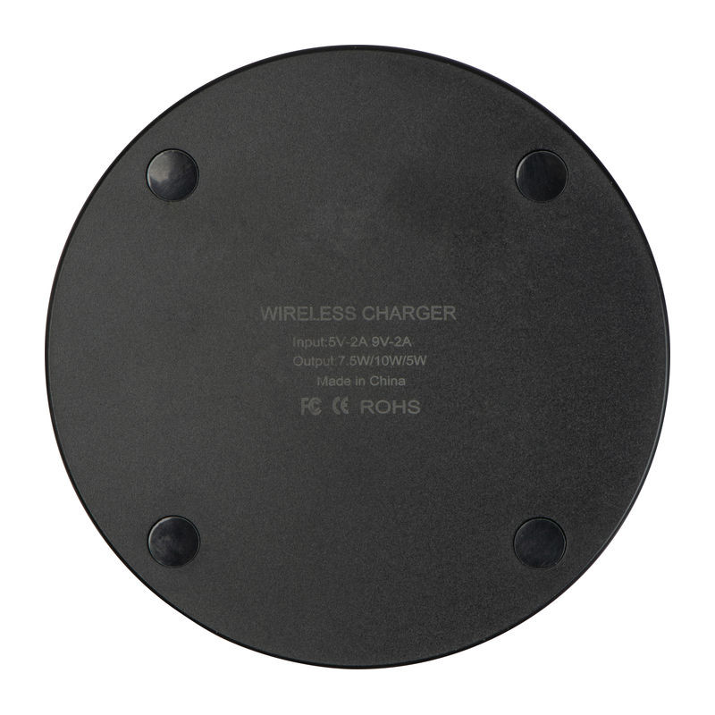 Plastová bezdrátová nabíječka s funkcí rychlého nabíjení (výkon až 10 W) a LED displejem. Zařízení je připraveno k nabíjení po rozsvícení zeleného LED kroužku; během nabíjení svítí modrý LED kroužek. Vaše logo gravírujeme do středu desky, gravírování svítí během připojení nabíječky. Vstup: 5V-2A 9V-2A, Výstup: 7,5W/15W/5W (15W rychlé nabíjení).