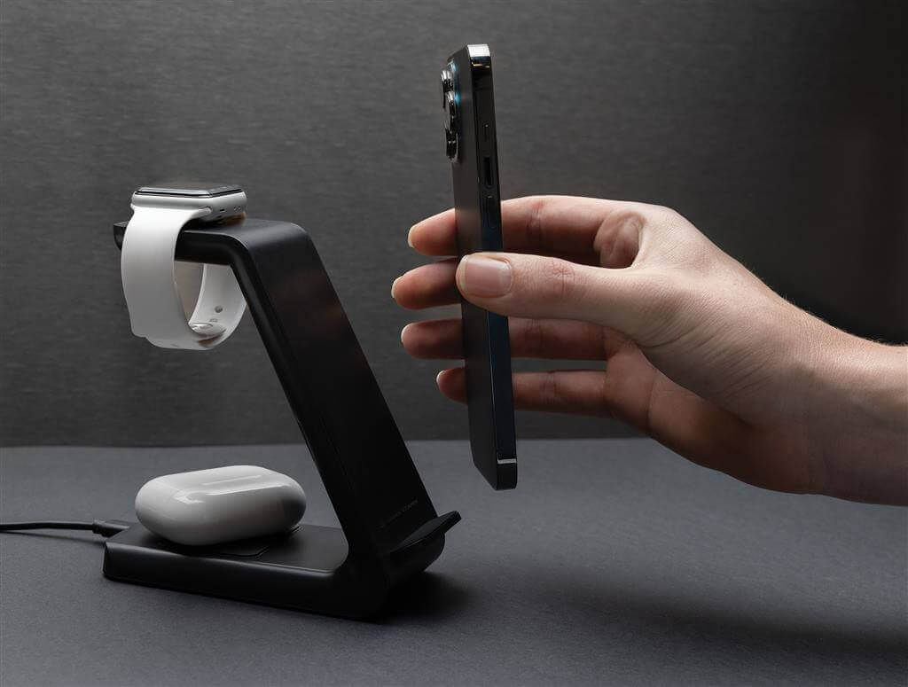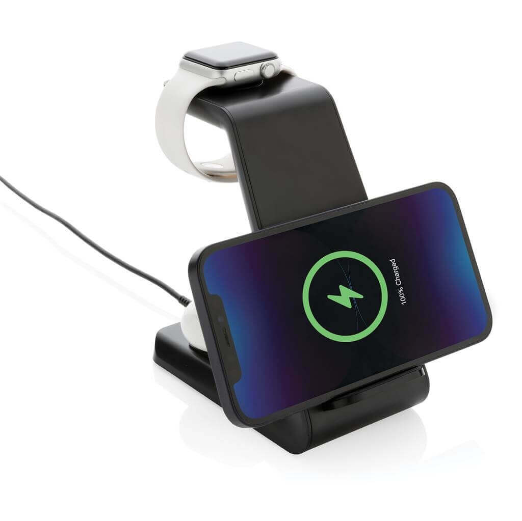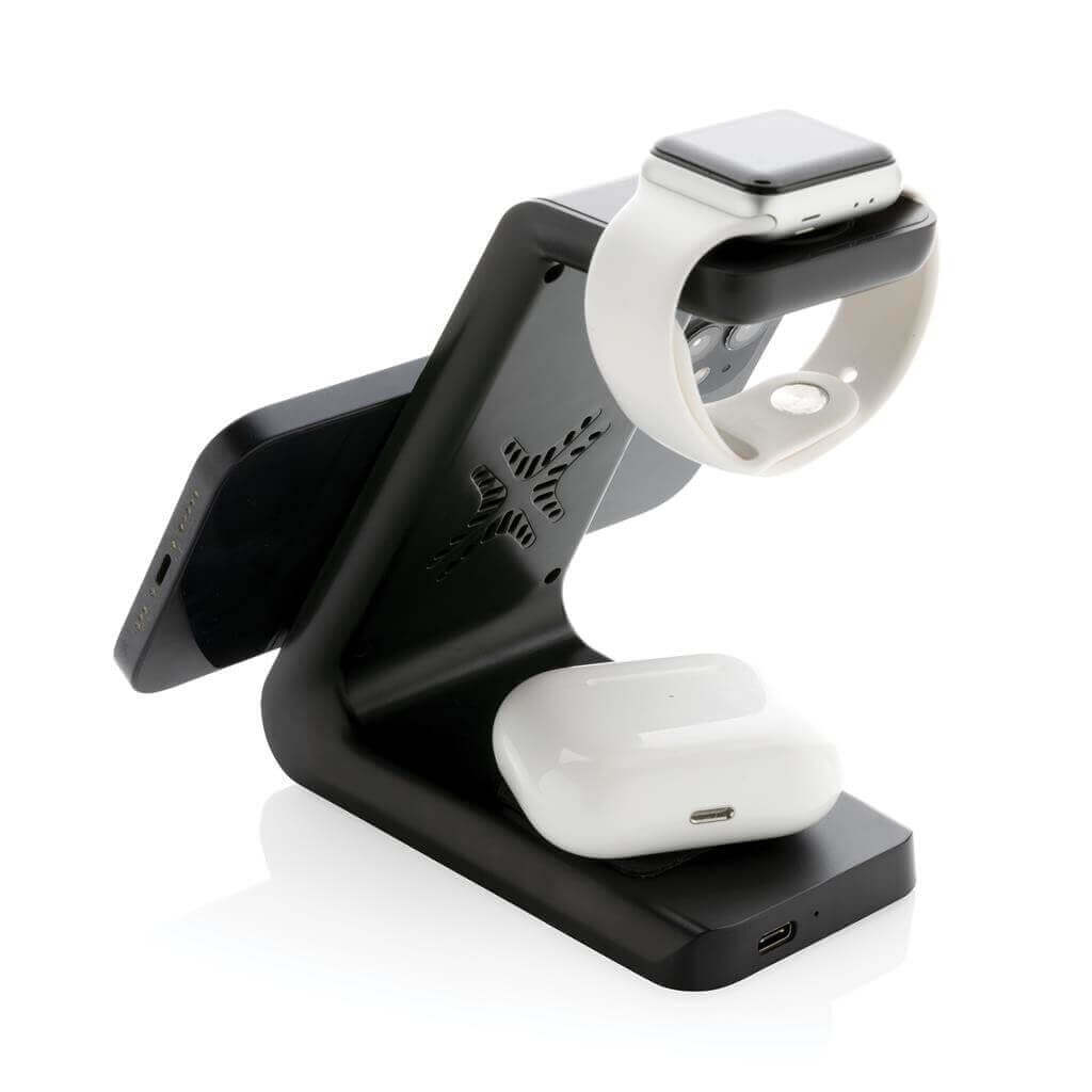 Univerzální bezdrátově nabíjecí stanice pro až 3 zařízení. Část určená pro telefon je vybavená duální cívkou s nejvyšším možným výkonem 15 W, dodatečná plocha pro další telefon nebo sluchátka s výkonem 5 W na zadní straně, závěsná část určená pro iWatch s výkonem 3 W. Vyrobeno z RCS recyklovaného ABS plastu. RCS (Recycled Claim Standard) je globální standard, který umožňuje ověřit použití recyklovaného materiálu v produktu napříč celým dodavatelským řetězcem. Celkový podíl recyklátu dle váhy produktu: 60 %. Včetně 120 cm USB C nabíjecího kabelu z RCS recyklovaného TPE. Produkt i příslušenství bez PVC. Baleno v dárkovém balení Urban Vitamin s minimálním obsahem plastů. Vstup: 5V/3A, 9V/2A, 5V/1A, 9V /1.1A.