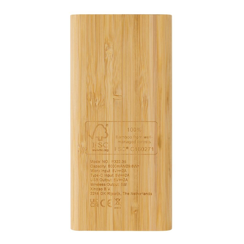 Powerbanka s kapacitou 8 000 mAh vyrobená ze 100 % FSC certifikovaného bambusu. Obsahuje vysoce kvalitní lithium polymerovou baterii řady A s kapacitou 8 000 mAh pro plné nabití telefonu až 4x. Včetně indikátorů stavu nabití. Bezdrátové nabíjení je kompatibilní se všemi telefony podporujícími QI, jako jsou nejnovější generace Android, iPhone 8 a výše. Micro USB a USB C vstup: 5V/2A. USB A, Micro USB a USB C výstup: 5V/2A. Bezdrátový výstup: 5V/1A 5W. Včetně nabíjecího kabelu z recyklovaného TPE. Bez PVC. Baleno v FSC krabičce. 1 baterií typu Li-poly súčasťou balenia.