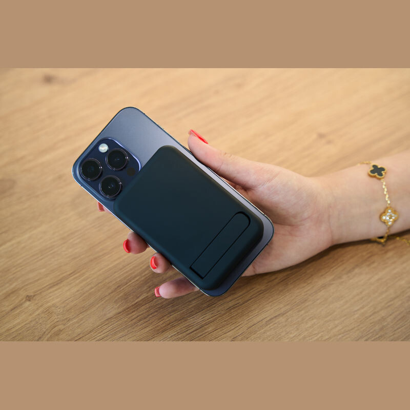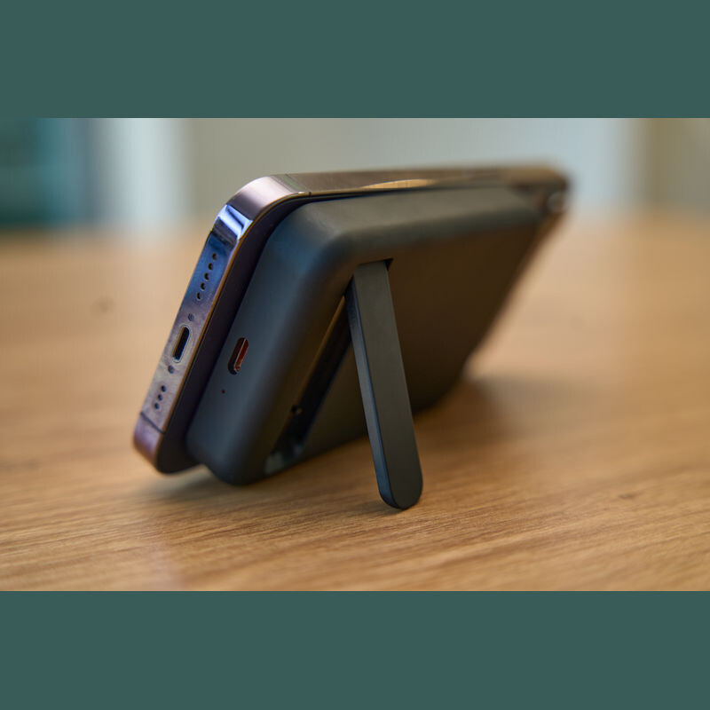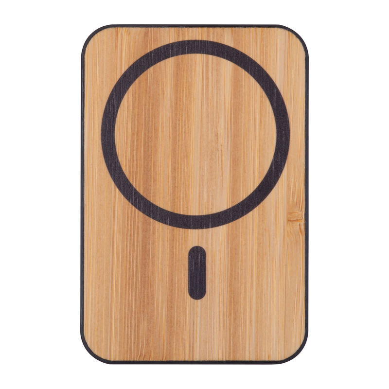 MagSafe powerbanka s kapacitou 5 000 mAh z plastu s bambusovou aplikací na přední straně a pryžovým povrchem na zadní straně. S vysouvací opěrkou a USB-C nabíjecím kabelem (výstup 15W). Kompatibilní s iPhone 12 a novějšími modely a Android zařízeními s funkcí MagSafe nabíjení.