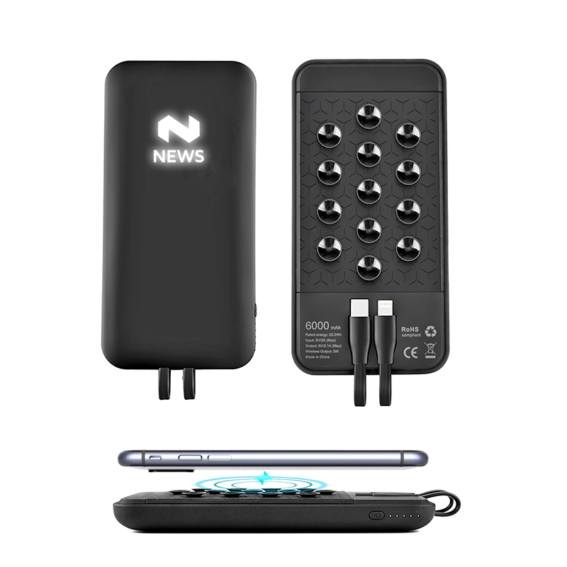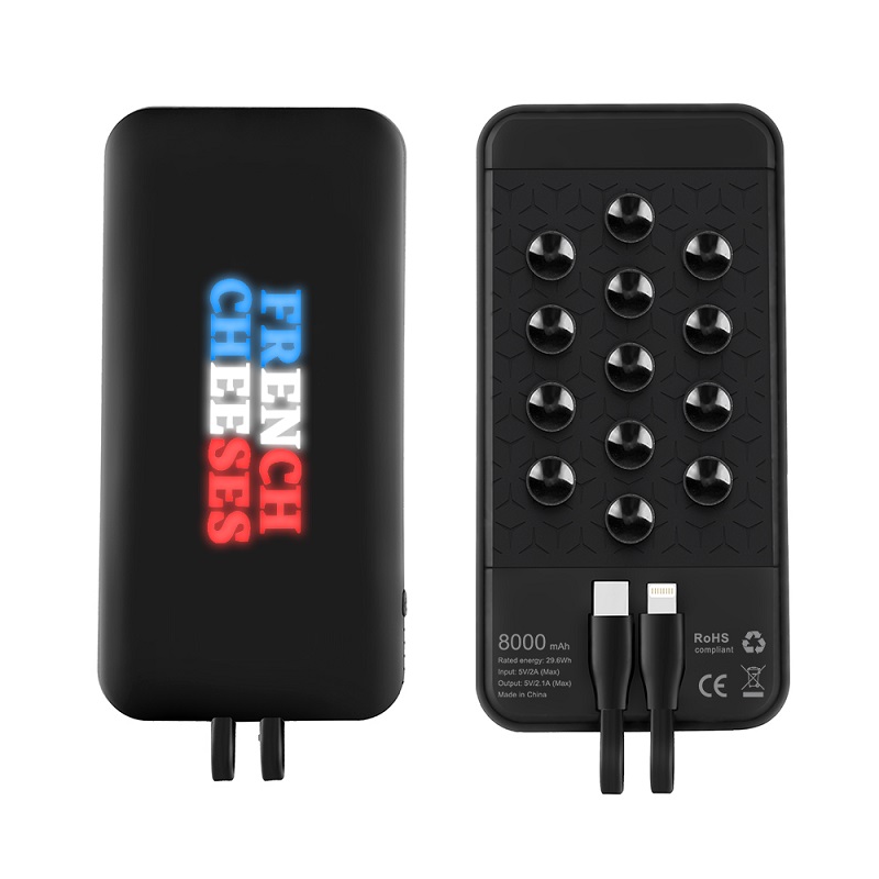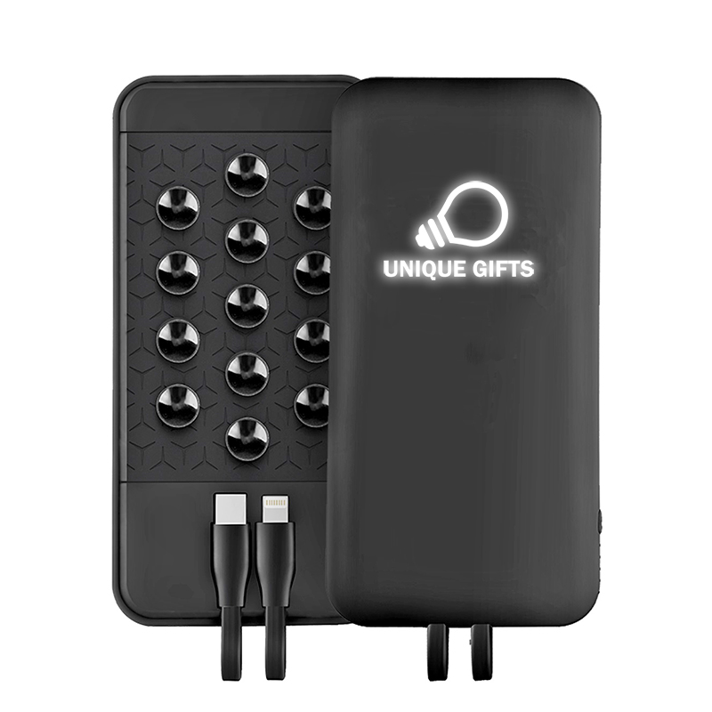 Bezdrátová power banka s integrovanými kabely a přísavkami je vybavena bezdrátovou technologií a baterií 8000 mAh. Zajistí, aby vaše přístroje byly okamžitě dobíjeny i bez použití kabelů. Zařízení můžete začít jednoduše napájet tak, že je umístíte na power banku. Dokáže nabít různé typy chytrých telefonů. Obsahuje vestavěné napájecí kabely Typu – C a Lightning (iPhone). Přísavkami jednoduše a pevně uchytíte nabíjený přístroj a externí baterii k sobě. Černou verzi power banky je možné doplnit efektním bílým LED logem a bílou verzi barevným potiskem. Obě varianty mají své osobité kouzlo.