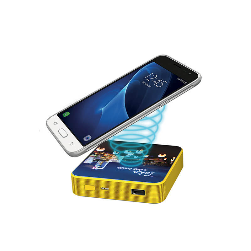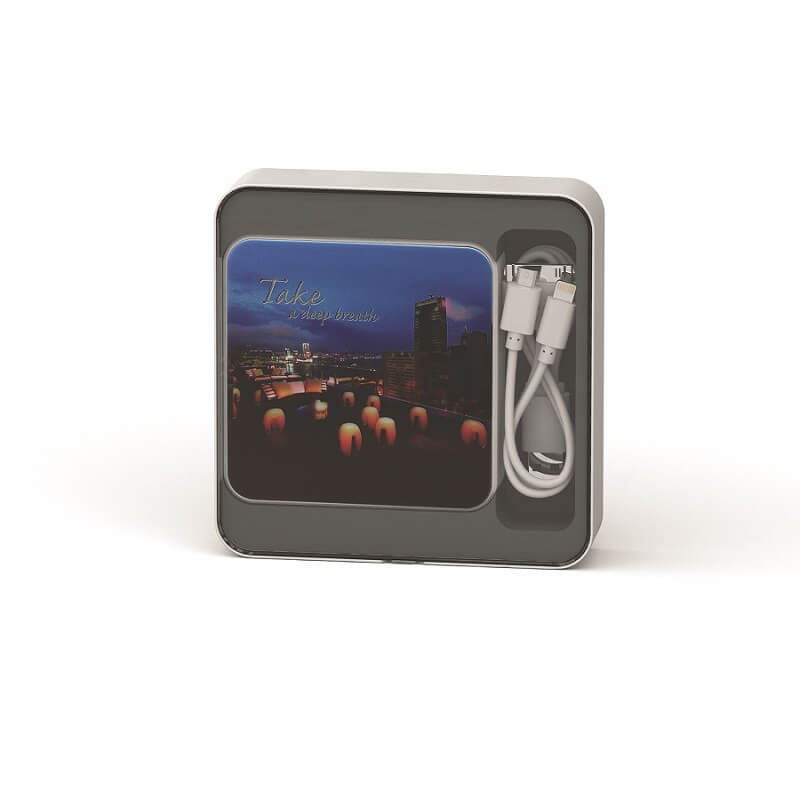 Praktická bezdrátová power banka s USB výstupem a bezdrátovým nabíjením je praktickým vybavením pro položení na stůl či nošení v tašce. Výhodou této power banky ve čtvercovém tvaru je možnost bezdrátového nabíjení pomocí indukční technologie. V případě, že váš telefon nemá funkci Qi nabíjení, je možné doplnit jej externím Qi přijímačem. Možnost nabíjení i z klasického USB výstupu pak dělá z této bezdrátové power banky moderní, avšak stále univerzální dárek pro každého. Na první pohled upoutá LED podsvícení, které perfektně zvýrazní vaše logo vytvořené reliéfním celoplošným CMYK potiskem. Na výběr máte z nekonečného množství barev, protože power banku dodáváme ve vlastní barvě z palety Pantone již od 50 kusů! Tuto power bankou s kapacitou až 6000 mAh můžeme doplnit luxusní transparentní krabičkou a nechat tak jedinečnou grafiku vyniknout již v balení.