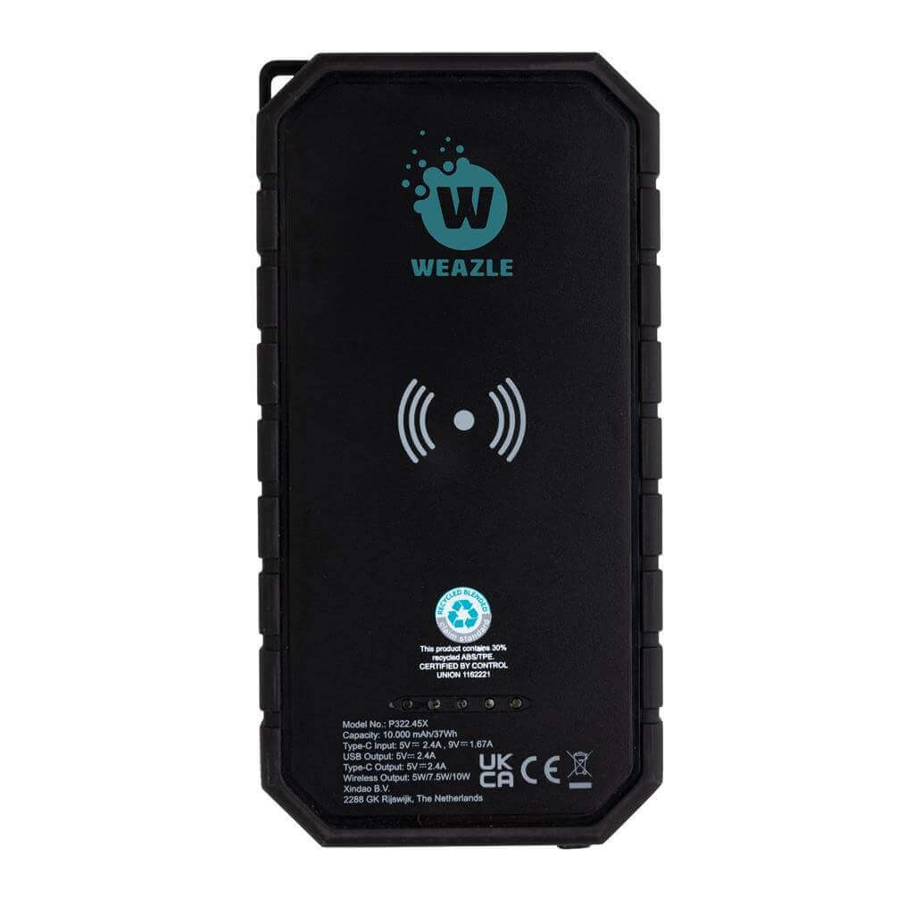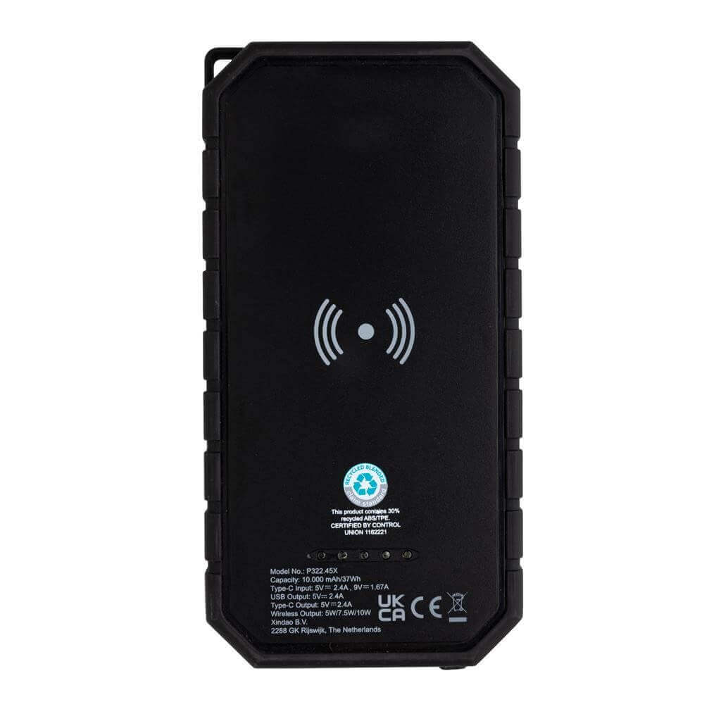 Powerbanka s kapacitou 10 000 mAh s výkonnou 10 W bezdrátovou nabíječkou. Vyrobená z RCS recyklovaného ABS a TPE. RCS (Recycled Claim Standard) je globální standard, který umožňuje ověřit použití recyklovaného materiálu v produktu napříč celým dodavatelským řetězcem. Celkový podíl recyklátu dle váhy produktu: 30 %. Umožňuje nabíjení jak skrze kabel (USB A i USB C), tak skrze rychlé bezdrátové nabíjení 10 W. Bezdrátové nabíjení je kompatibilní se všemi telefony podporujícími QI, jako jsou nejnovější generace Android, iPhone 8 a výše. Navíc je vybavena solárním nabíjením, svítilnou a karabinou pro zavěšení. Spolu s voděodolnosti IPX5 je ideální na outdoorové aktivity. Včetně USB C nabíjecího kabelu z GRS recyklovaného TPE. USB výstup: 5V/2,4A, USB C výstup: 5V/2,4A. Baleno v FSC kraftové dárkové krabičce. Produkt i příslušenství jsou 100 % bez PVC. 1 baterií typu Li-poly súčasťou balenia.