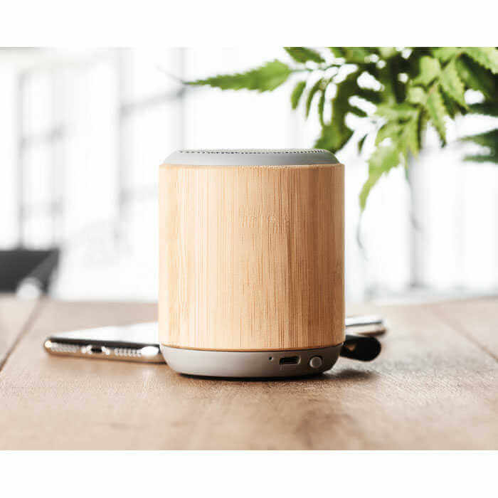 Bezdrátový reproduktor 5.0 s bambusovým krytem, vrchní částí z ABS a PU popruhem. Tento kompaktní a přenosný reproduktor můžete snadno přenášet. Připojte svůj chytrý telefon a poslouchejte svou oblíbenou hudbu, ať jste kdekoli. Reproduktor je vybaven dobíjecí Li-Ion baterií s kapacitou 300 mAh, která má při plném nabití přibližnou dobu přehrávání 2 hodiny. Výstupní údaje: V případě potřeby je možné reprodukovat hudbu z reproduktoru: 3 W, 4 Ohm. Bambus je přírodní materiál, u každého jednotlivého kusu se mohou vyskytnout drobné odchylky v barvě a velikosti, které mohou mít vliv na finální podobu potisku.