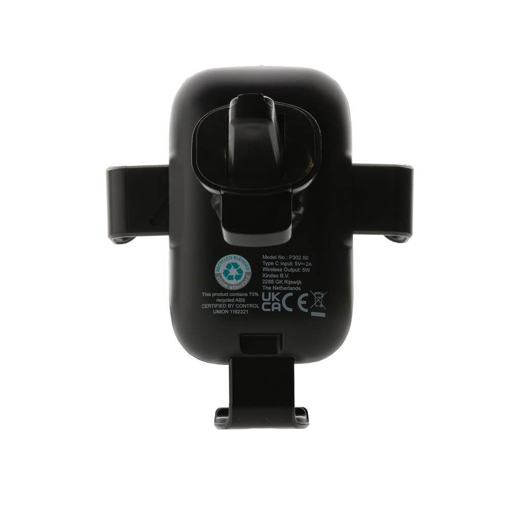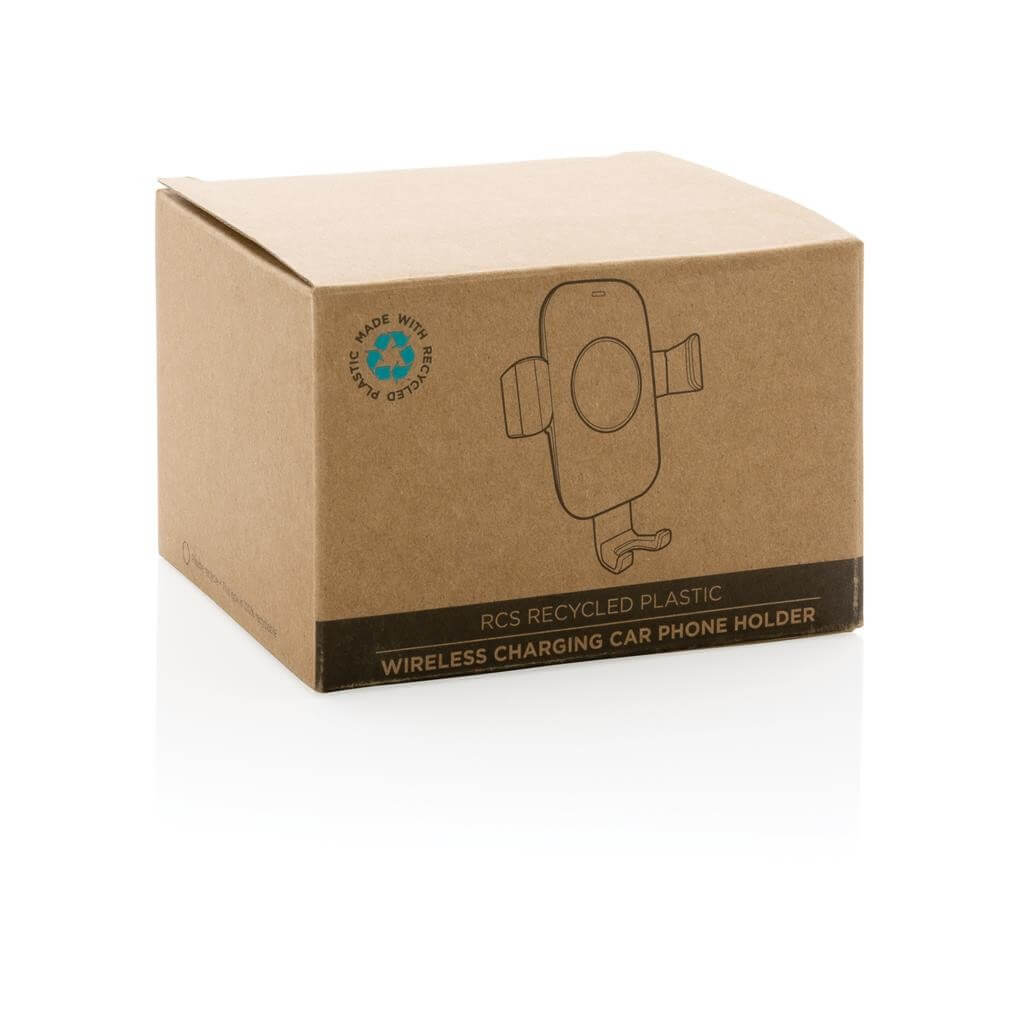 Držák telefonu do auta s rychlým 10 W bezdrátovým nabíjením. Vyrobený z RCS recyklovaného ABS plastu. RCS (Recycled Claim Standard) je globální standard, který umožňuje ověřit použití recyklovaného materiálu v produktu napříč celým dodavatelským řetězcem. Celkový podíl recyklátu dle váhy produktu: 73 %. Bezdrátové nabíjení je kompatibilní se všemi telefony podporujícími QI, jako jsou nejnovější generace Android, iPhone 8 a výše. Včetně USB C nabíjecího kabelu z RCS recyklovaného TPE. USB vstup: 9V/2A. Bezdrátový výstup: 9V/1,1A (10W). Baleno v FSC® kraftové dárkové krabičce. Vhodné pro telefony o velikosti do 6,5".