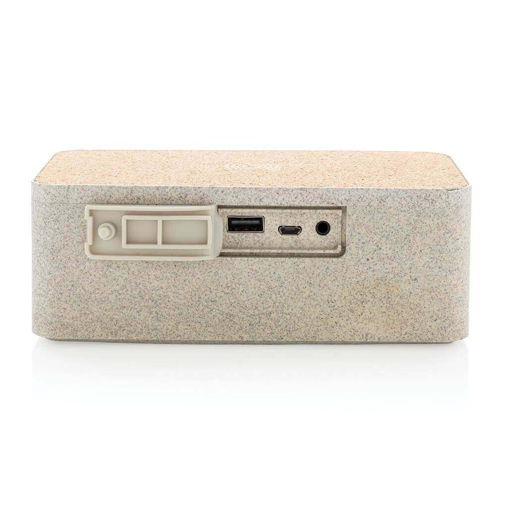 Elegantní 5W bezdrátový reproduktor s 5W bezdrátovou nabíječkou vyrobený ze zbytků slámy (35 %) s detaily z korku. 1 200 mAh baterie umožňuje poslech po dobu až 4h. BT 5.0 pro hladké bezdrátové připojení na vzdálenost až 10m. Při používání obou funkcí je doporučeno připojení k napájení skrze přiložený 1,5m dlouhý USB C kabel. 1 baterie typu 18650 v balení