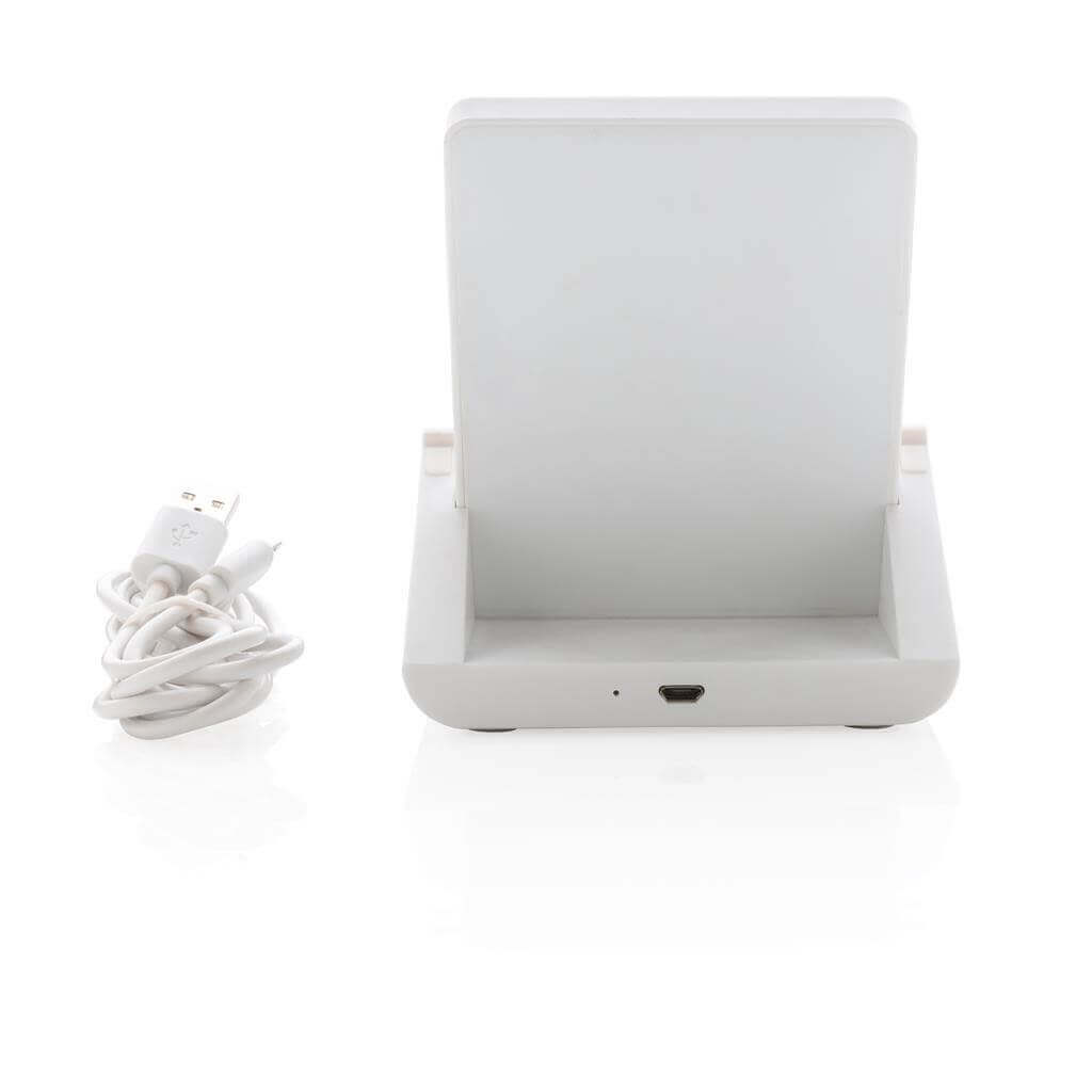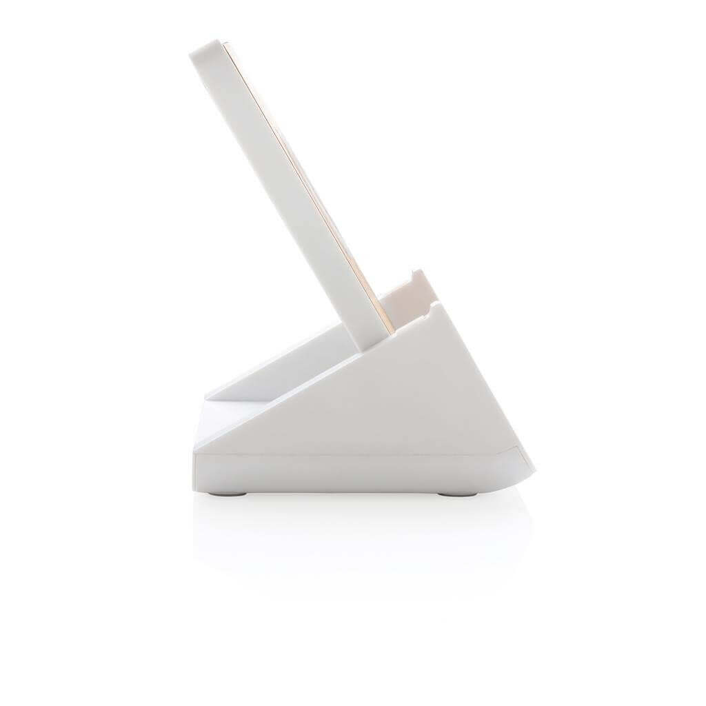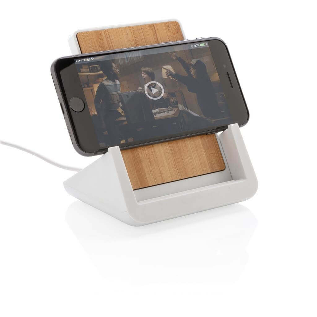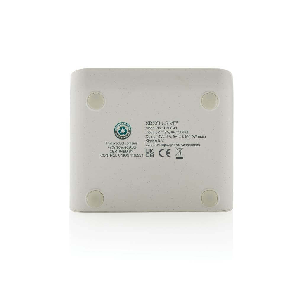 Stojánek na telefon s rychlým bezdrátovým nabíjením s výkonem 10 W. Vyrobený z RCS recyklovaného ABS plastu. RCS (Recycled Claim Standard) je globální standard, který umožňuje ověřit použití recyklovaného materiálu v produktu napříč celým dodavatelským řetězcem. Celkový podíl recyklátu dle váhy produktu: 47 %. Oblast bezdrátového nabíjení je vyrobená ze 100 % FSC® bambusu. 2 USB výstupy na zadní straně pro nabíjení dalších zařízení. Včetně 120 cm USB C nabíjecího kabelu z RCS recyklovaného TPE. Kompatibilní se všemi zařízeními podporujícími Qi jako jsou nejnovější generace Android a iPhone 8 a výše. Vstup USB C: 5V/2A, 9V/2A. Bezdrátový výstup: 5V/1A, 9V/1,1A 10 W. Baleno v FSC® dárkové krabičce. Ochranný vzor®