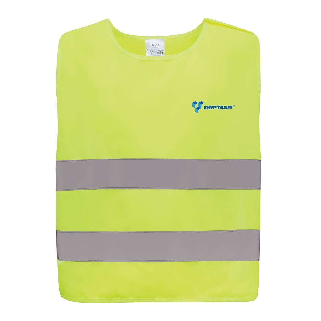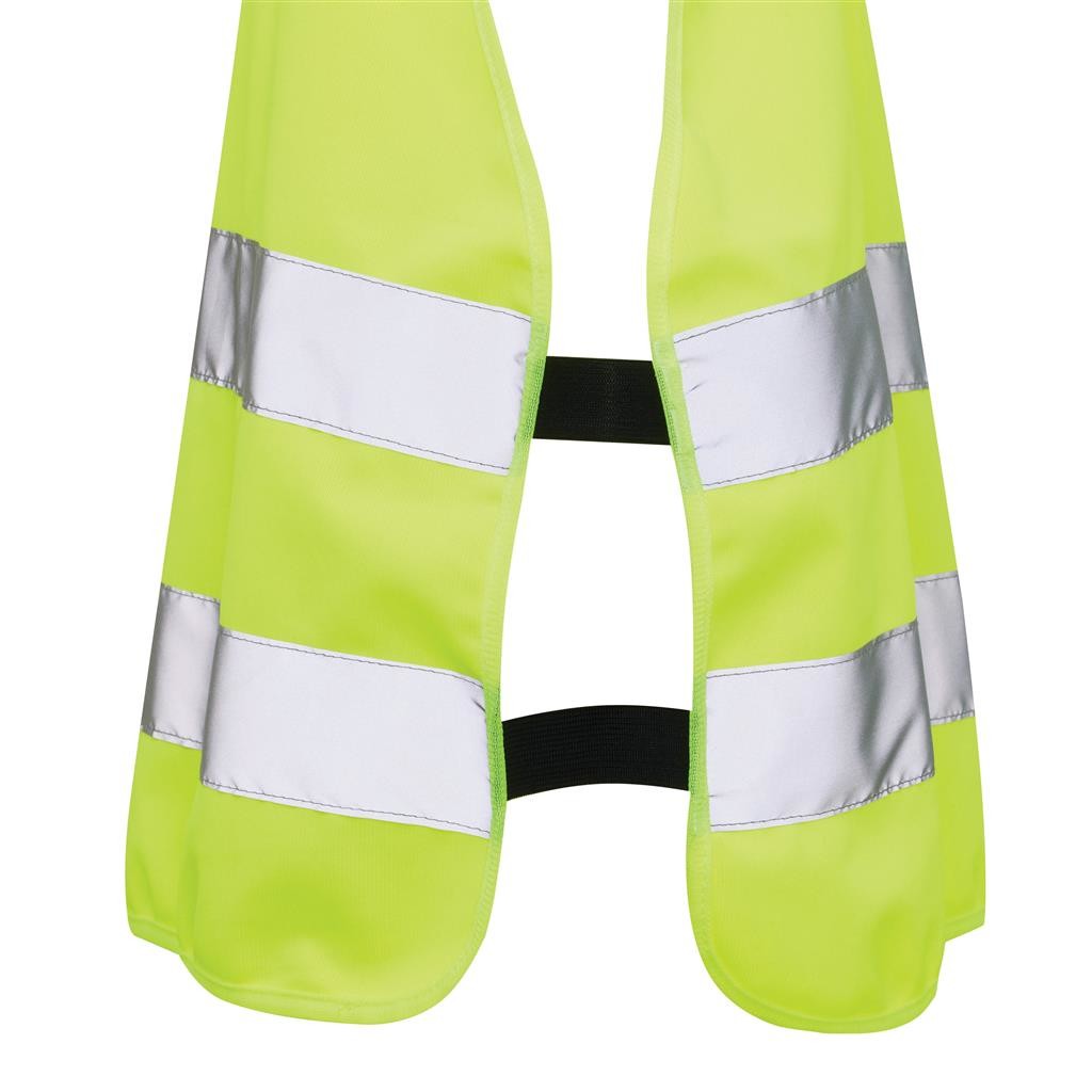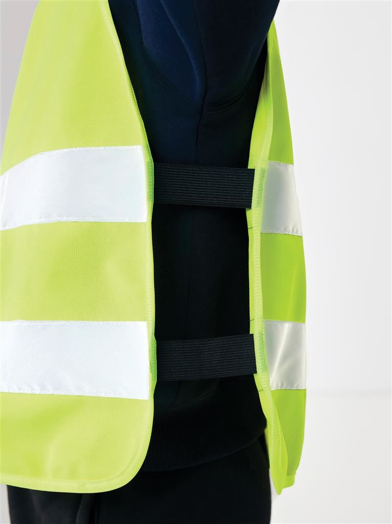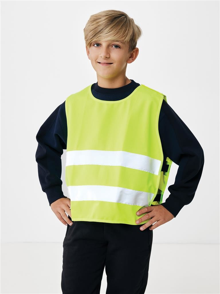 Vysoce viditelná bezpečnostní vesta velikosti S určená pro děti ve věku 7-12 let, výšky 90-155 cm. Velká plocha vhodná pro potisk na přední i zadní straně. Háček a zapínání na poutka pro snadné oblečení. Elastické gumičky na vnitřní straně pro vyšší pružnost při nošení přes jiný oděv. Přísně testováno, v souladu s normou EN 17353:2020 typ AB3. Dále v souladu s pokyny dle nařízení (EU) 2016/425 pro osobní ochranné prostředky kategorie II. Vyrobené z GRS recyklovaného PET. GRS (Global Recycle Standard) je globální standard, který umožňuje ověřit použití recyklovaného materiálu v produktu napříč celým dodavatelským řetězcem. Celkový podíl recyklátu dle váhy produktu: 58 %.