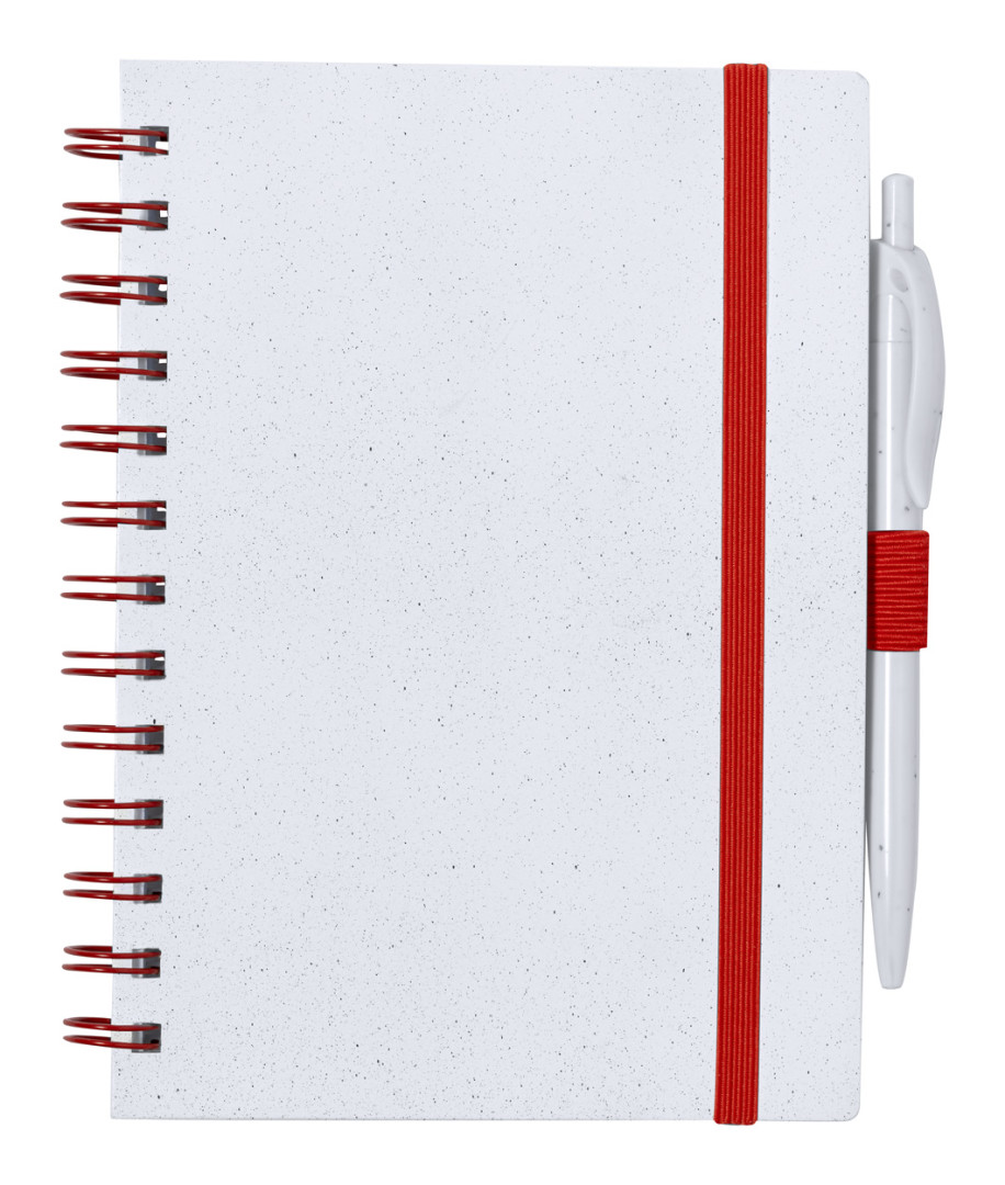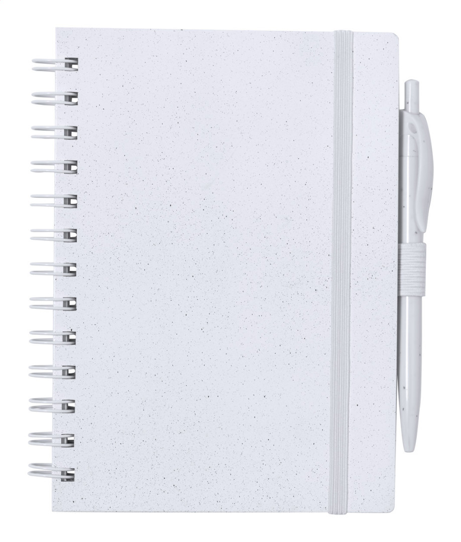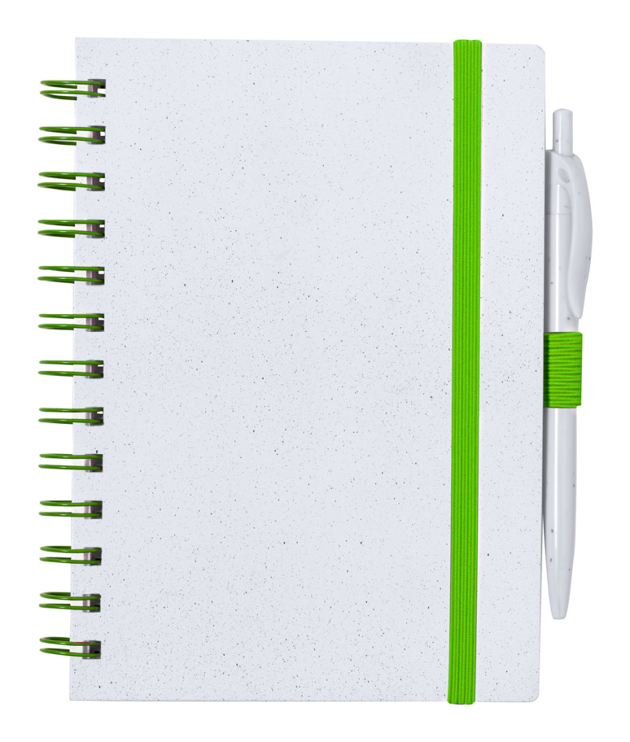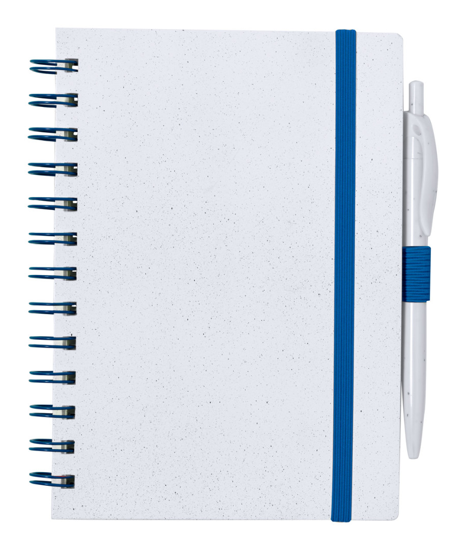 Spirálový blok z recyklovaného ABS se 70 linkovanými listy z recyklovaného papíru. Se spirálovými kroužky ve stejné barvě, gumovým páskem a držákem na pero. Včetně kuličkového pera z recyklovaného ABS plastu s modrou náplní.