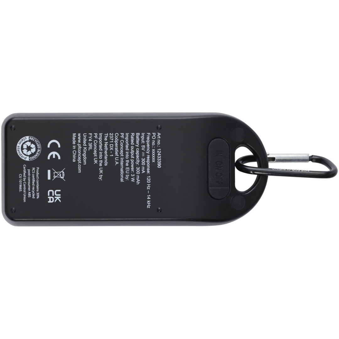 3W Bluetooth® reproduktor z recyklovaného RCS, který přehrává hudbu, podcasty atd. z jakéhokoli zařízení podporujícího technologii Bluetooth®, takže je ideálním společníkem pro každou příležitost. Díky přiložené karabině lze reproduktor snadno připevnit na batoh a krytí IPX4 jej chrání před občasným deštěm. Užijte si až 1,5 hodiny hudby při maximální hlasitosti díky 300mAh Li-ion baterii. Doba nabíjení činí 1,5 hodiny. Bluetooth® 5.0 s pracovním dosahem přibližně 10 metrů. Dodáváno s uživatelskou příručkou, karabinou, 50cm nabíjecím kabelem USB-A na Typ C a zabaleno v krabici ze 100% recyklovaného kraftového papíru.