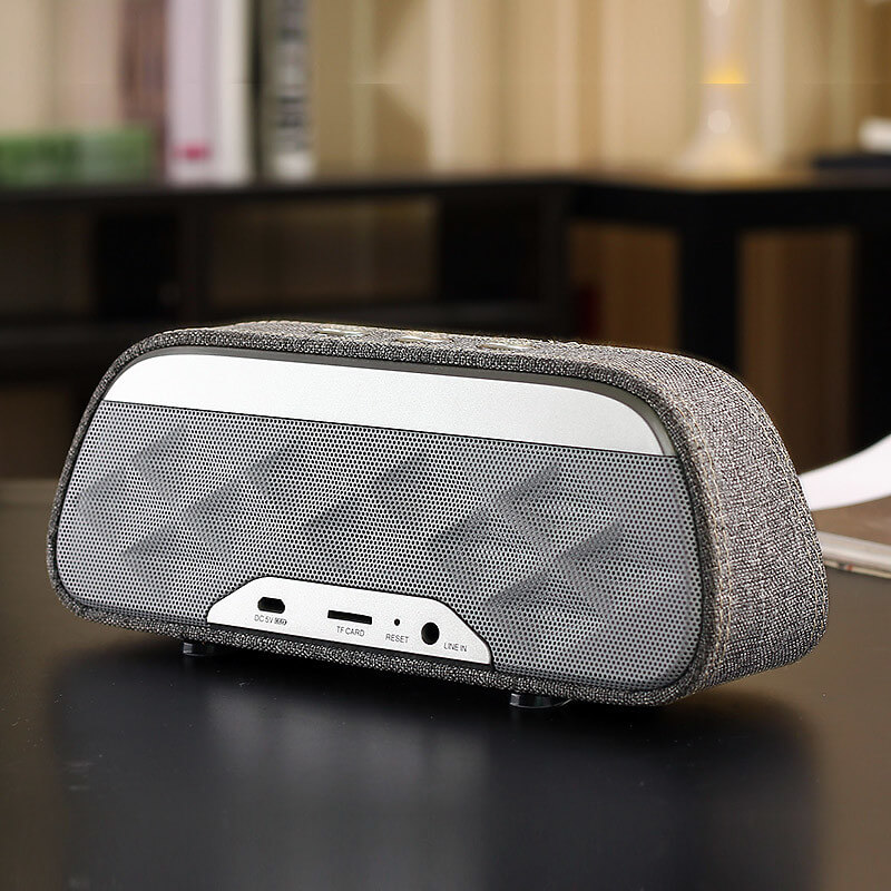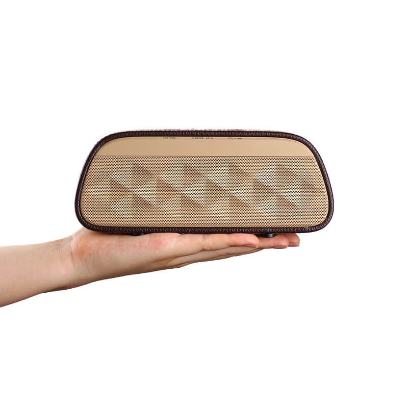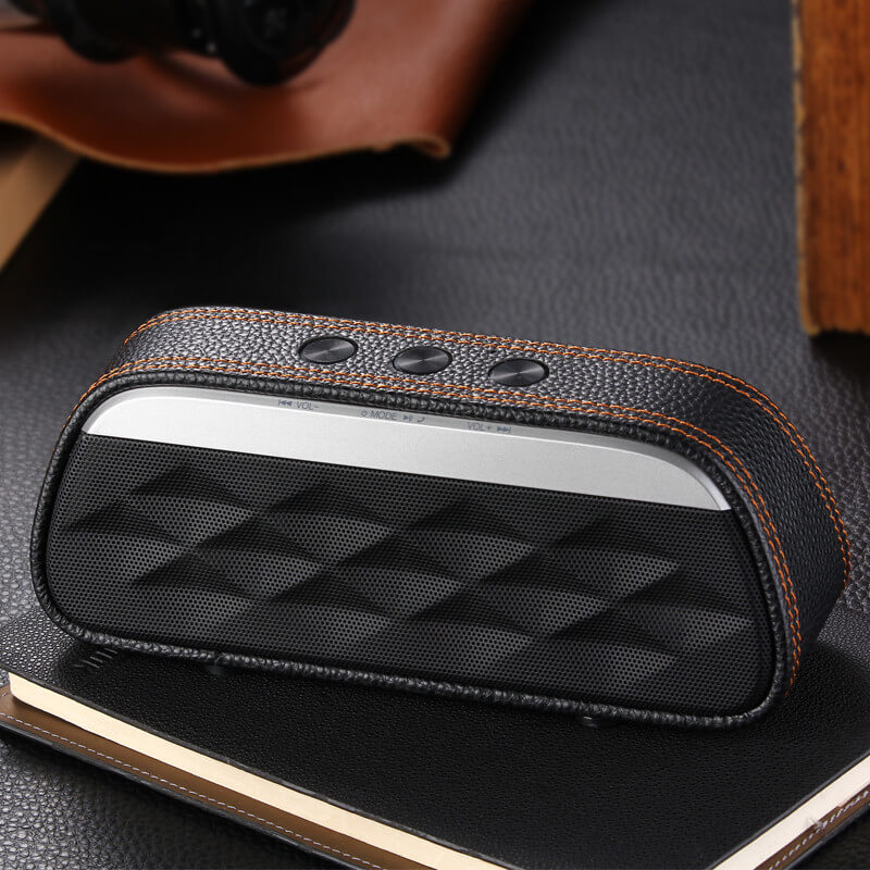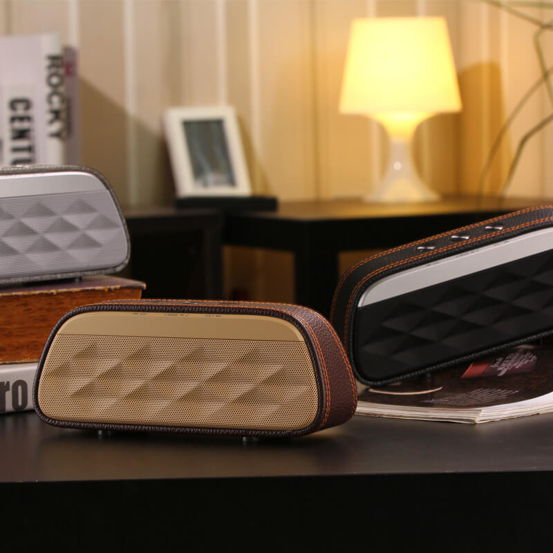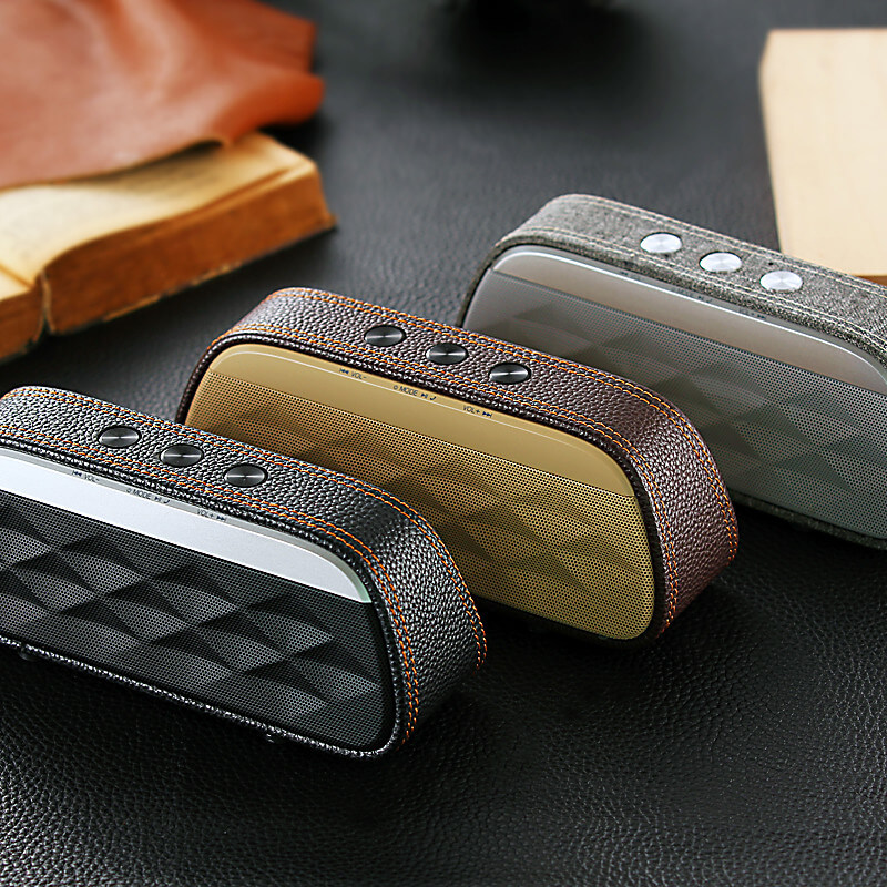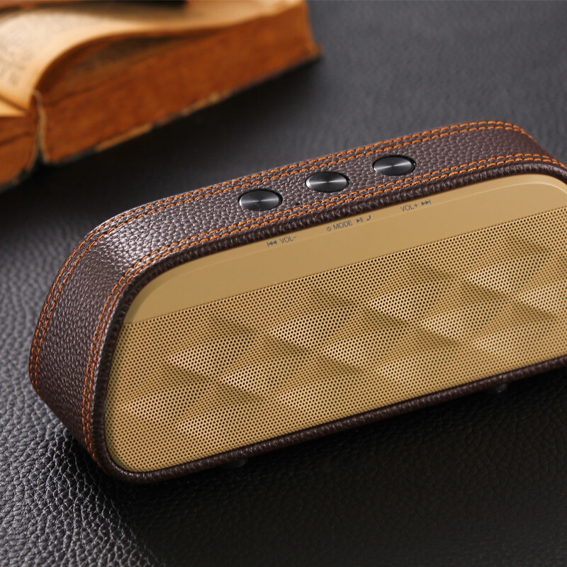 Originální a luxusně vypadající Bluetooth reproduktor zaujme na první pohled i poslech. O kvalitní přehrávání hudby se postará luxusní bezdrátový reproduktor, který se svým chytrým zařízením spojíte pomocí technologie Bluetooth 3.0 s EDR pro zrychlení přenosu a dosahem až 10 metrů. Bezdrátový reproduktor má k dispozici také slot pro micro SD / TF kartu. Díky kapacitě baterie 1200 mAh vydrží přehrávat poměrně dlouhou dobu. Specifický design je zapříčiněn promyšlenou kombinací plastového materiálu, imitace kůže a textilu. Aby byl výsledek ještě o kousek lepší a více originální, můžete si objednat svůj vlastní potisk.