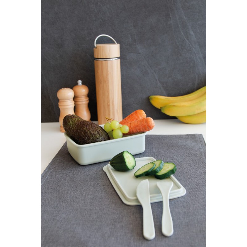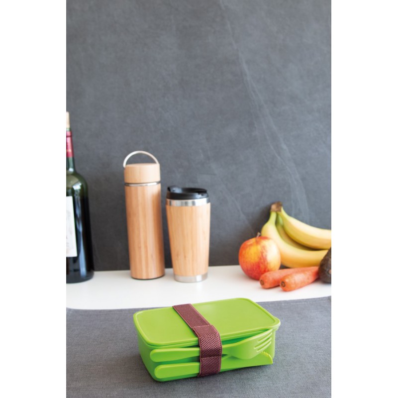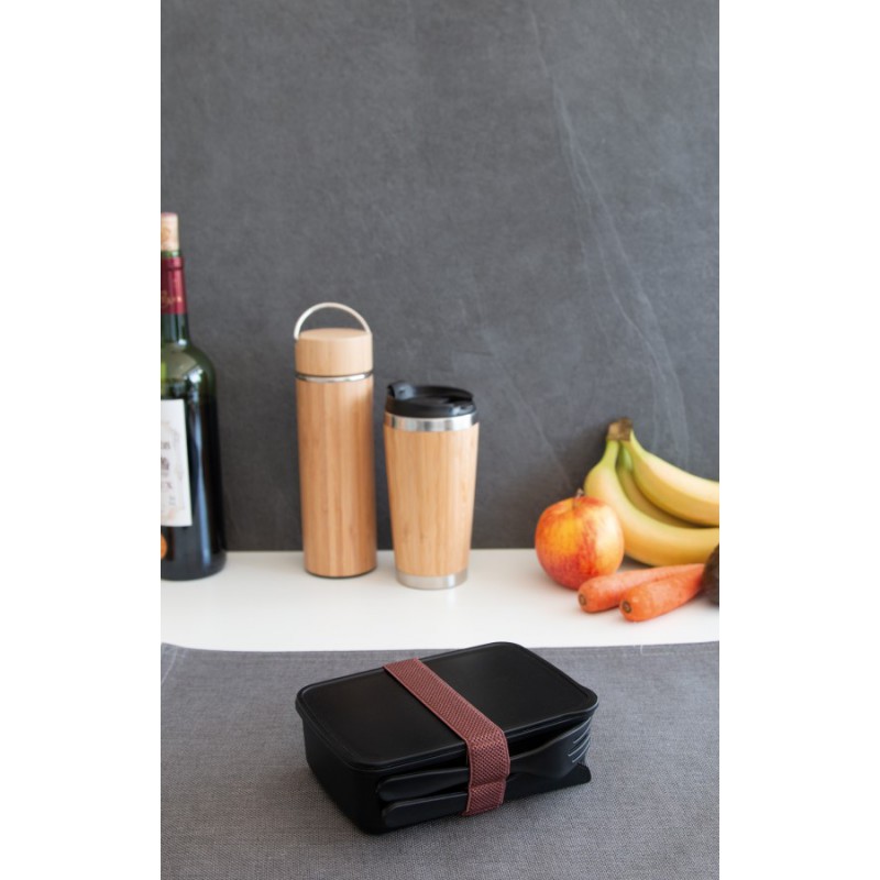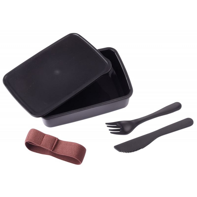 Box na oběd NOONTIME: box se silikonovým utěsněným víkem, gumička pro pevné uchycení víka, páska je určena k uchycení nože a vidličky, kapacita cca. 700 ml, příslušenství (řemínek + příbory) dodáváno uvnitř krabičky.