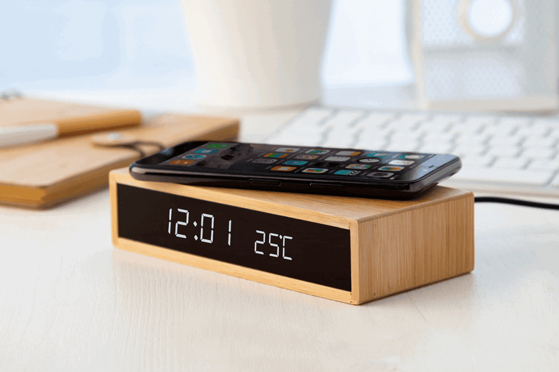 Multifunkční budík v bambusovém pouzdře s LED displejem, teploměrem a vestavěnou bezdrátovou nabíječkou. Max. výstup: 1000 mA. Včetně USB nabíjecího kabelu.
