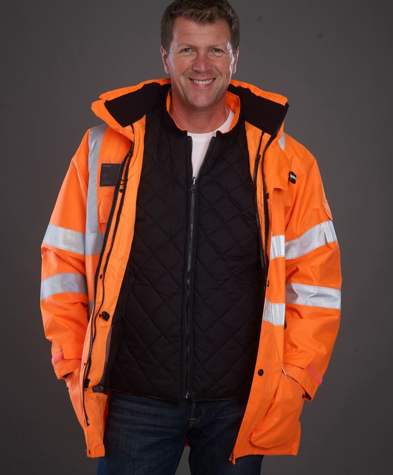 Voděodolná, prodyšný materiál, odnímatelná kapuce, náprsní kapsa, podlepené švy, zip uvnitř k připevnění vnitřní bundy, certifikováno podle EN ISO 20471:2013 třída 3, garantované reflexní vlastnosti podle EN - normy pro 25 praní, pratelné na 40°, vnitřní bunda: odnímatelné rukávy, po 2 vnějších a vnitřních kapsách, lze nosit oboustranně, certifikováno podle EN ISO 20471 třída 2