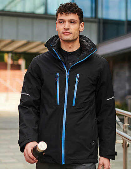 Nepromokavý a prodyšný strečový materiál Isotex 10 000 na vnějším oděvu vyhovuje normě EN343 3:2, utěsněné švy a povrchová úprava DWR (odolná a vodoodpudivá) pro ochranu za každého počasí | Ochranné kapsy RFID blokují skenery, a tím chrání vaše údaje a snižují riziko digitální krádeže | Plně izolovaná vnitřní bunda s panelem s termoreflexní podšívkou udržuje teplo | Sbalitelná kapuce, kterou lze schovat do límce | 2 spodní kapsy na zip a 2 voděodolné náprsní kapsy na zip | Nepromokavý zip vepředu uprostřed | Skrytý zip v podšívce umožňuje přístup k výšivce, nastavovače pružné šňůrky u obličeje a na lemu | Reflexní prvky na rukávech a na zádech